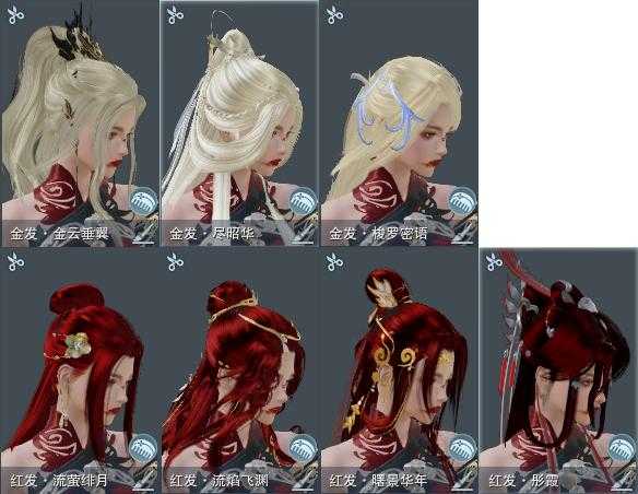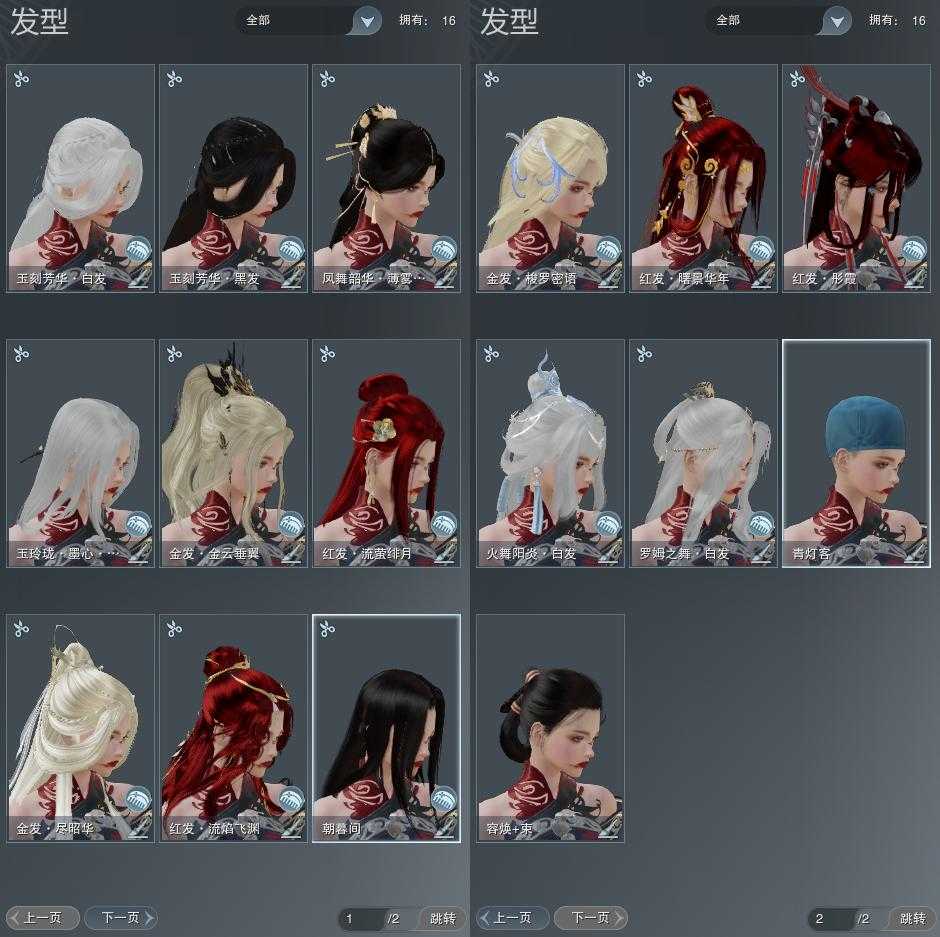 【发型】金发3个[资历金, 中秋金, 苍金], 红发4个[九红, 羊红, 猴红, 小资历红], 黑发4个, 白发4个, 盒子发型[薄雾黑发, 墨心白发], 总页数2