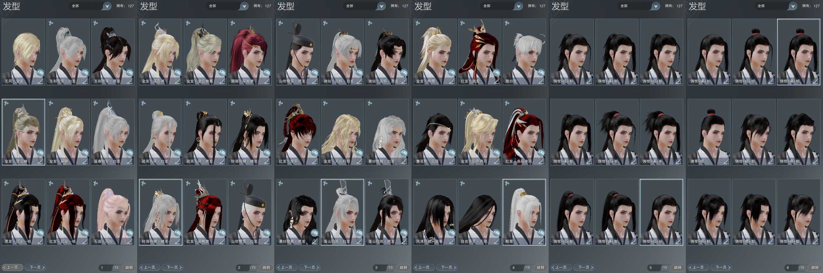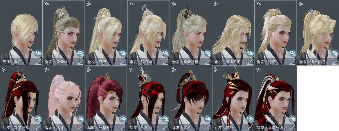 【发型】金发8个[国金, 猪金, 丝路金, 苍金, 巴卡金, 虎金, 三代金, 无风金发], 红发7个[八红, 十红, 十二红, 紫发, 凤仙粉, 猪红, 鼠红], 黑发11个, 白发10个, 盒子发型[二代花朝黑, 丝路黑, 黑谪仙黑发, 山吹樱雪黑发, 白楼兰黑发, 二代花朝白, 丝路白, 澡盒黑发, 黑谪仙白发, 山吹樱雪白发, 白楼兰白发, 澡盒白发, 十二黑, 红梅盒白发], 总页数6
