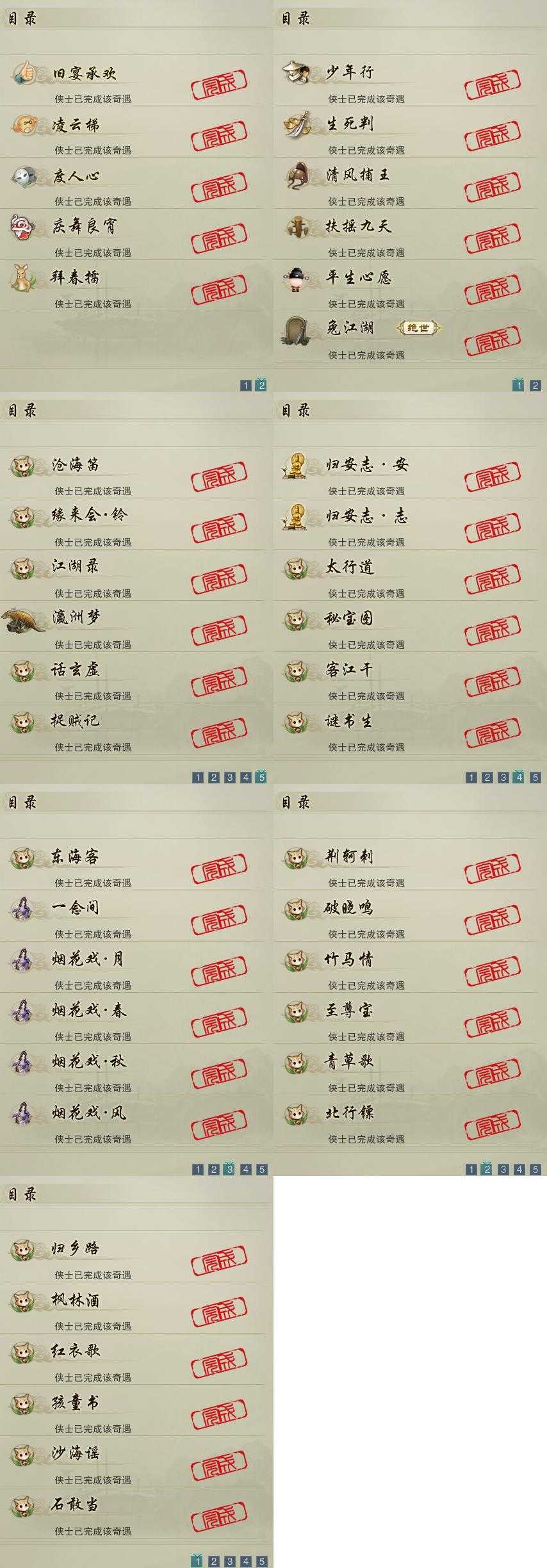 【奇遇】11个[平生心愿, 兔江湖, 少年行, 扶摇九天, 清风捕王, 庆舞良宵, 生死判, 凌云梯, 度人心, 旧宴承欢, 拜春擂]