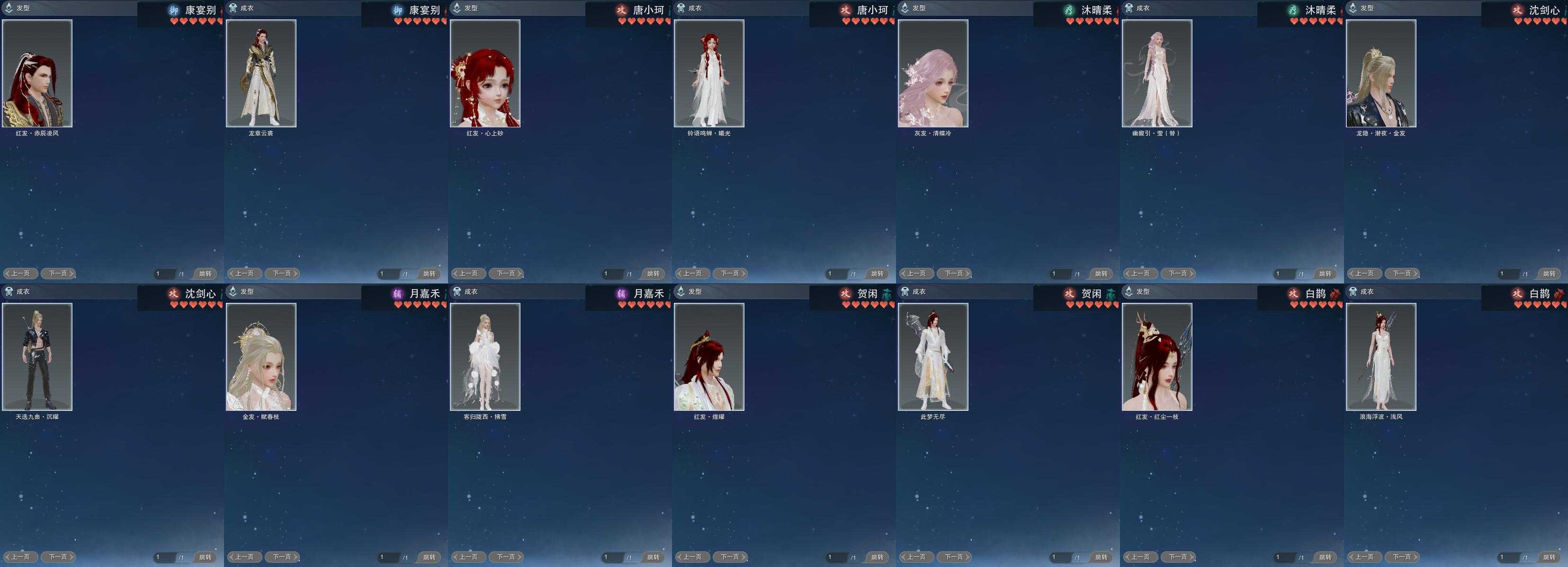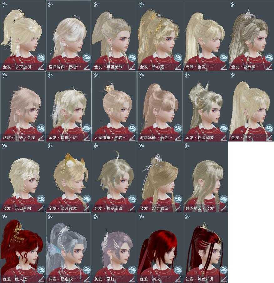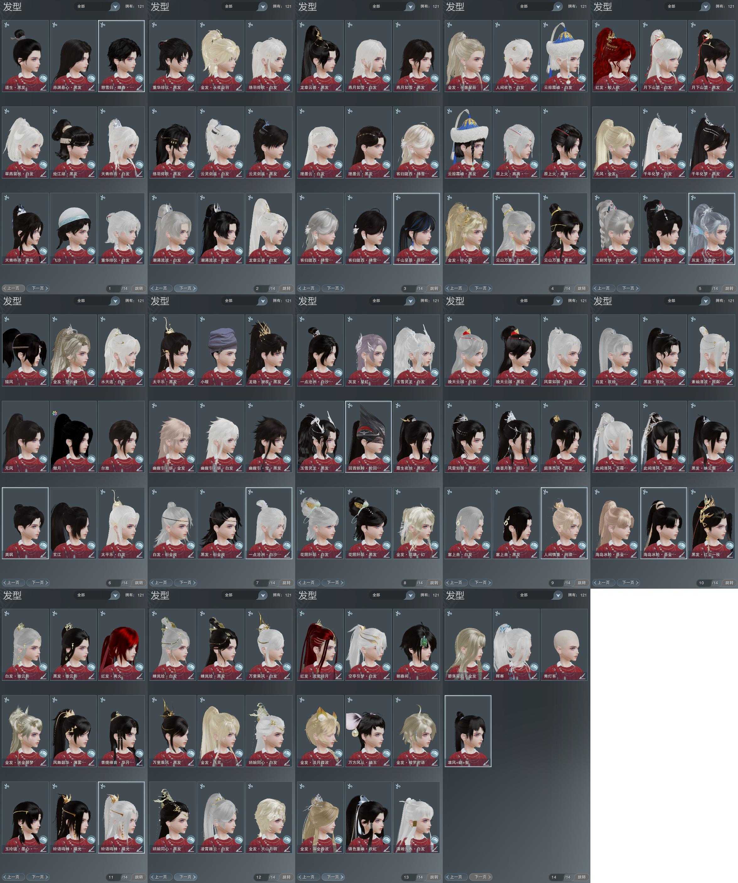 【发型】金发19个[资历金, 蝶金, 苏金, 倒闭金, 丝路金, 飒金, 牛金, 海金, 三代金, 铃金, 无风金发, 精灵金, 蛇金, 永夜金, 金海岛金发, 紫人间金发, 紫幽馥金发, 黑龙隐金发, 白陇西金发], 红发10个[八红, 十二红, 蝶粉, 兔红, 小资历红, 大资历红, 十五红, 蛇红, 二代灰, 三代灰银], 黑发59个, 白发39个, 盒子发型[四代七夕黑发, 乘风黑发, 晴岚绘黑发, 白楼兰黑发, 踏云白发, 四代七夕白发, 乘风白发, 晴岚绘白发, 白楼兰白发, 墨心黑发, 华月黑发, 薄雾黑发, 十二黑, 金海岛黑发, 蓝异域黑发, 蓝异域白发, 蓝水袖白发, 白幽昙黑发, 弓盒黑发, 弓盒白发, 踏青黑发, 红黑妖眸盒黑发, 灵龙盒黑发, 踏青白发, 紫沧洲盒黑发, 灵龙白发, 紫沧洲盒白发, 白幽馥黑发, 黑龙隐黑发, 紫幽馥白发, 梦盒黑发, 九七黑发, 红上火黑发, 梦盒白发, 九七白发, 蓝千山黑发, 云掠霜峰黑发, 红上火白发, 白陇西黑发, 人间夜色白发, 燕月盒黑发, 墨龙盒黑发, 云掠霜峰白发, 白陇西白发, 燕月盒白发, 墨龙盒白发, 仙剑黑发, 潮涌盒黑发, 络羽黑发, 瓷盒黑发, 仙剑白发, 潮涌盒白发, 络羽白发, 瓷盒白发, 红毛衣黑发], 总页数14
