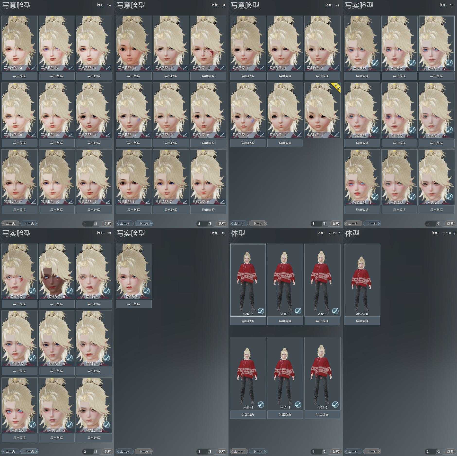 【捏脸】写意脸型24个,写实脸型19个,体型7个