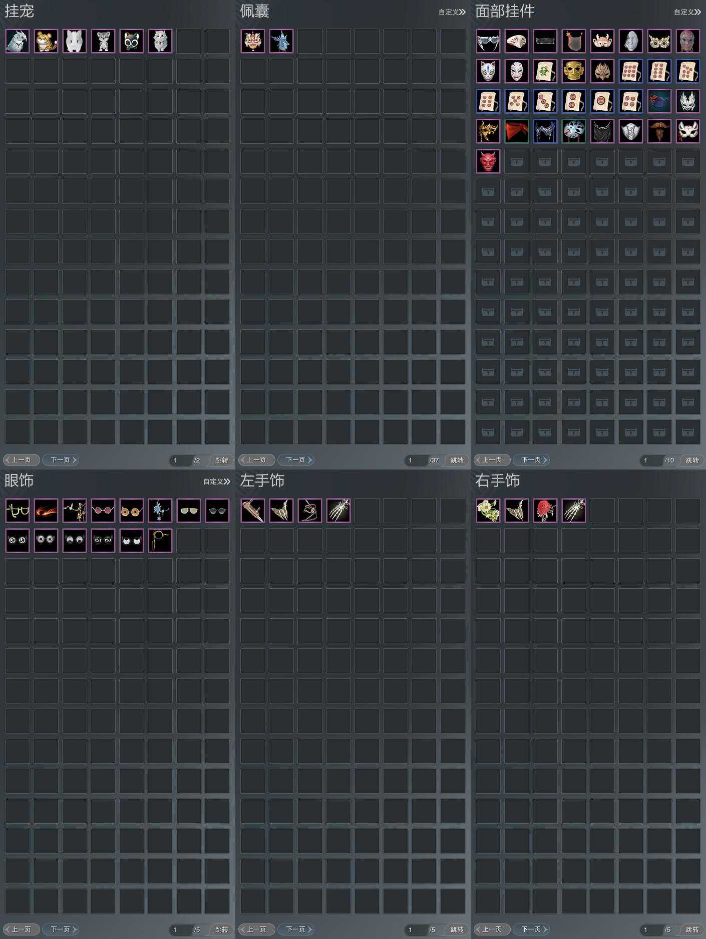 【肩饰】23左,21右,[玄龙夜舞·左, 风明雪华·左, 双鱼曳波·慧福·左, 双鱼曳波·如意·左, 双鱼曳波·无量·左, 双鱼曳波·极乐·左, 栖鹤云归·左, 漱玉寒·紫殿·左, 霜落轻裘·左, 日月无心·左, 华焰披锦·左][玄龙夜舞·右, 风明雪华·右, 栖鹤云归·右, 漱玉寒·紫殿·右, 霜落轻裘·右, 日月无心·右]
