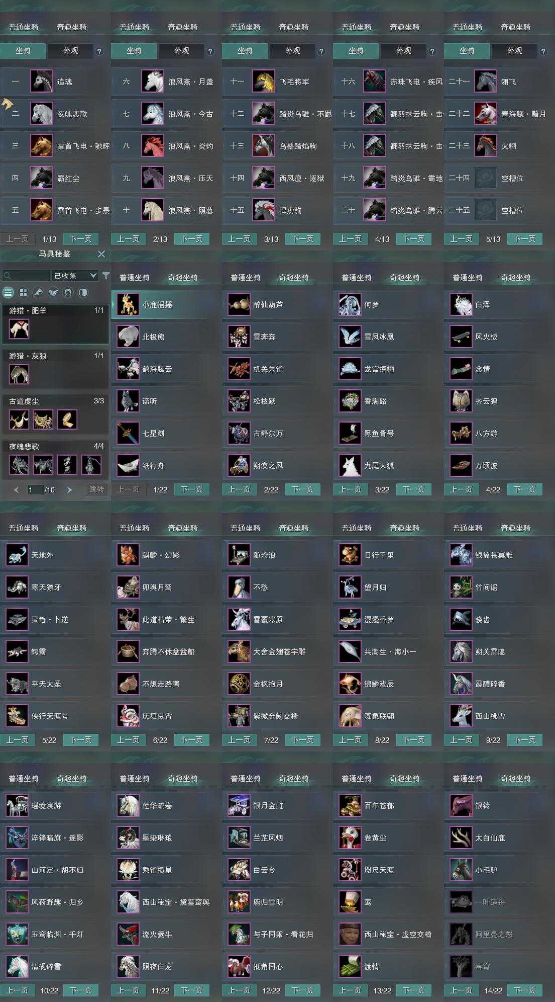 【坐骑】23个[踏炎不羁, 踏炎腾云, 踏炎霸地, 西风瘦逐狱, 赤珠疾风, 青海骢黯月, 飞毛将军, 翻羽抹云驹击云, 翻羽抹云驹击云, 黑翅马, 浪风燕今古, 霸红尘, 雷首飞电步景, 雷首飞电驰辉, 乌鬃踏焰驹]
