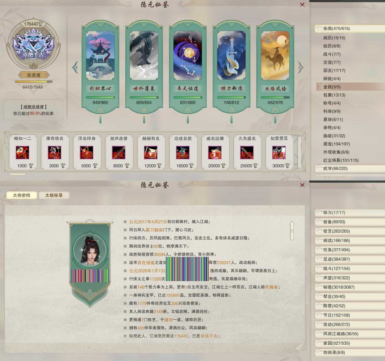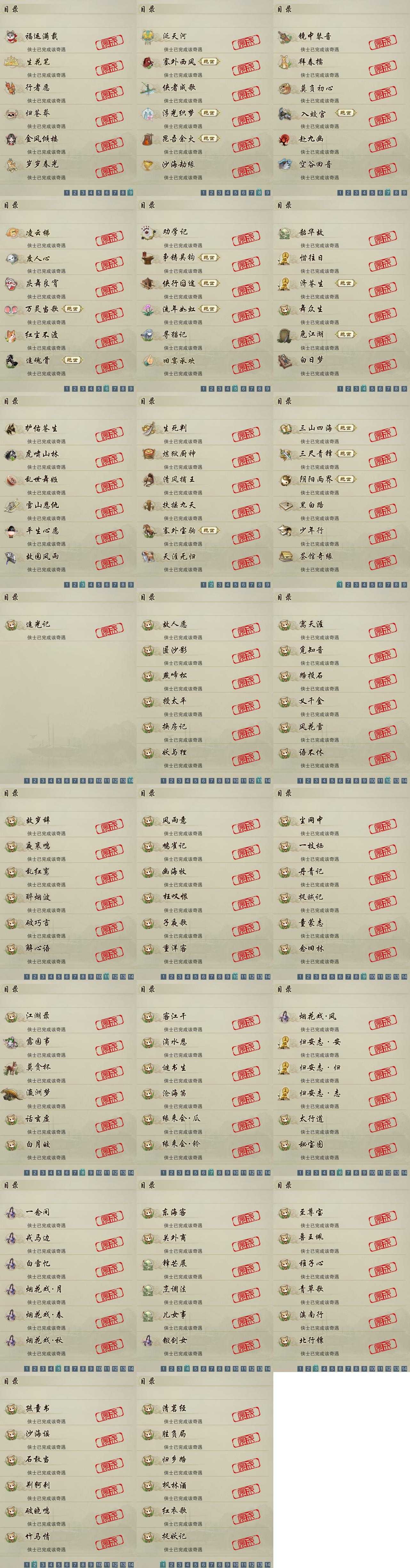 【奇遇】52个[白日梦, 天涯无归, 三山四海, 劝学记, 雪山恩仇, 阴阳两界, 莫负初心, 兔江湖, 平生心愿, 黑白路, 惜往日, 乱世舞姬, 塞外宝驹, 争铸吴钩, 韶华故, 虎啸山林, 济苍生, 护佑苍生, 少年行, 故园风雨, 扶摇九天, 三尺青锋, 流年如虹, 舞众生, 清风捕王, 侠行囧途, 寻猫记, 茶馆奇缘, 入蛟宫, 庆舞良宵]