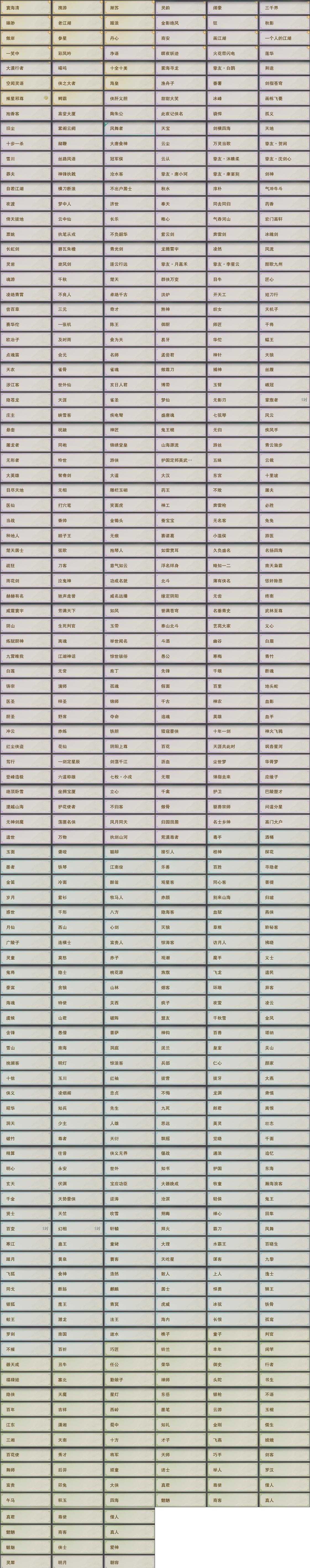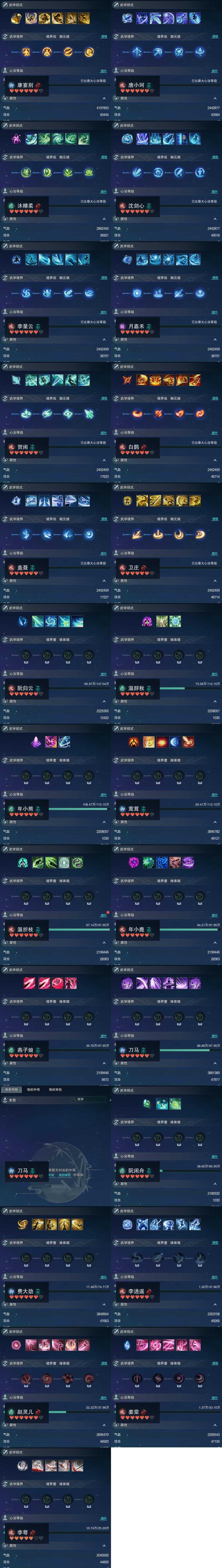 【同伴】康宴别90级境界伍,唐小珂90级境界伍,沐晴柔90级境界伍,沈剑心90级境界伍,李星云90级境界伍,月嘉禾90级境界伍,贺闲志90级境界伍,白鹊90级境界伍,盖聂志90级境界伍,卫庄90级境界伍,阮归云87级境界壹,温辞秋85级境界壹,年小熊85级境界壹,茸茸志85级境界壹,温折枝84级境界壹,年小鹿84级境界壹,燕子娘84级境界壹,刀马志84级境界壹,刀马志级,阮闲舟83级境界壹,费大劲82级境界壹,李逍遥77级境界壹,赵灵儿77级境界壹,姜棠76级境界壹,李萼74级境界壹