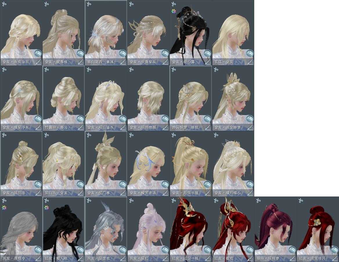 【发型】金发18个[狐金, 兔金, 资历金, 鸡金, 如归金, 凤金, 牛金, 双十二金发, 呱金, 雪金, 铃金, 玄江金发, 精灵金, 蛇金, 永夜金, 蓝游园金发, 竹露响暮云金发, 蓝陇西金发], 红发8个[十二红, 紫发, 蝶粉, 牛红, 小资历红, 十五红, 二代灰, 三代灰银], 黑发65个, 白发35个, 盒子发型[踏云黑发, 四代七夕黑发, 四代中秋蓝黑发, 乘风黑发, 晴岚绘黑发, 山吹樱雪黑发, 踏云白发, 四代七夕白发, 飞皇黑发, 四代中秋蓝白发, 晴岚绘白发, 山吹樱雪白发, 飞皇白发, 入梦黑发, 沧海黑发, 唐风玉壶黑发, 白红尘黑发, 蓝游园黑发, 蓝曲塘白, 沧海白发, 唐风玉壶白发, 白红尘白发, 鉴松影日昃黑发, 红六七黑发, 十二黑, 芙蓉黑发, 红六七白发, 芙蓉白发, 蓝异域黑发, 红懒猪黑发, 蓝异域白发, 花滑黑发, 星源黑发, 红人间黑发, 花滑白发, 星源白发, 七七黑发, 白幽昙黑发, 幽涧愀兮白发, 白玄玉黑发, 金鳞盒黑发, 除夕盒黑发, 蓝椿山黑发, 踏青黑发, 除夕盒白发, 灵龙盒黑发, 踏青白发, 灵龙白发, 白八中黑发, 白幽馥黑发, 蓝龙隐黑发, 游龙盒黑发, 游龙盒白发, 九七黑发, 白蛇盒黑发, 蓝上火黑发, 绿千山黑发, 红上火白发, 燕月盒黑发, 白千山白发, 绿寻香黑发, 蓝蝴蝶黑发, 燕月盒白发, 绿故梦黑发, 仙剑黑发, 潮涌盒黑发, 瓷盒黑发, 仙剑白发, 潮涌盒白发, 傀儡白发, 紫浮光黑发, 魔镜黑发, 紫云香黑发, 魔镜盒白发, 粉毛衣黑发], 总页数14
