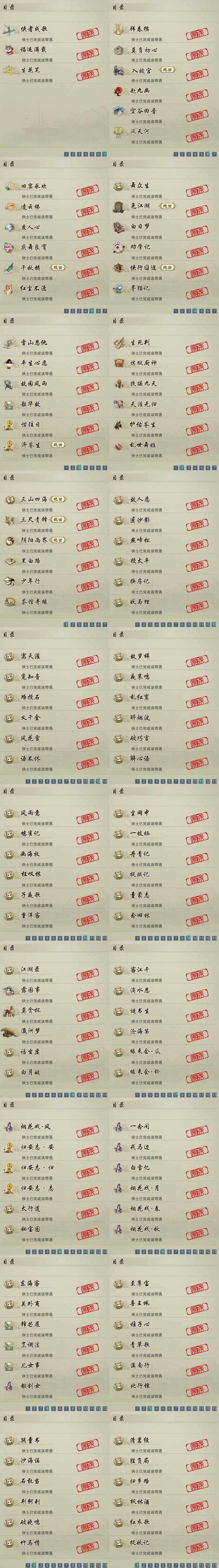 【奇遇】39个[白日梦, 天涯无归, 三山四海, 劝学记, 雪山恩仇, 阴阳两界, 莫负初心, 兔江湖, 平生心愿, 黑白路, 惜往日, 乱世舞姬, 韶华故, 济苍生, 护佑苍生, 少年行, 故园风雨, 扶摇九天, 三尺青锋, 舞众生, 侠行囧途, 寻猫记, 茶馆奇缘, 入蛟宫, 庆舞良宵, 生死判, 凌云梯, 千秋铸, 炼狱厨神, 赴九幽]
