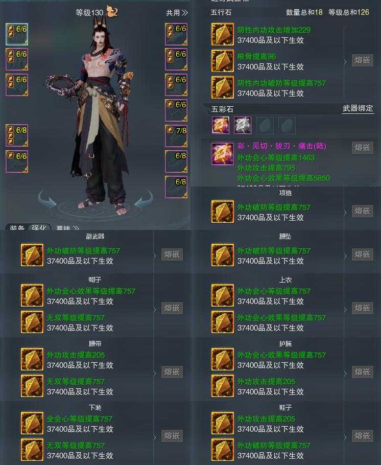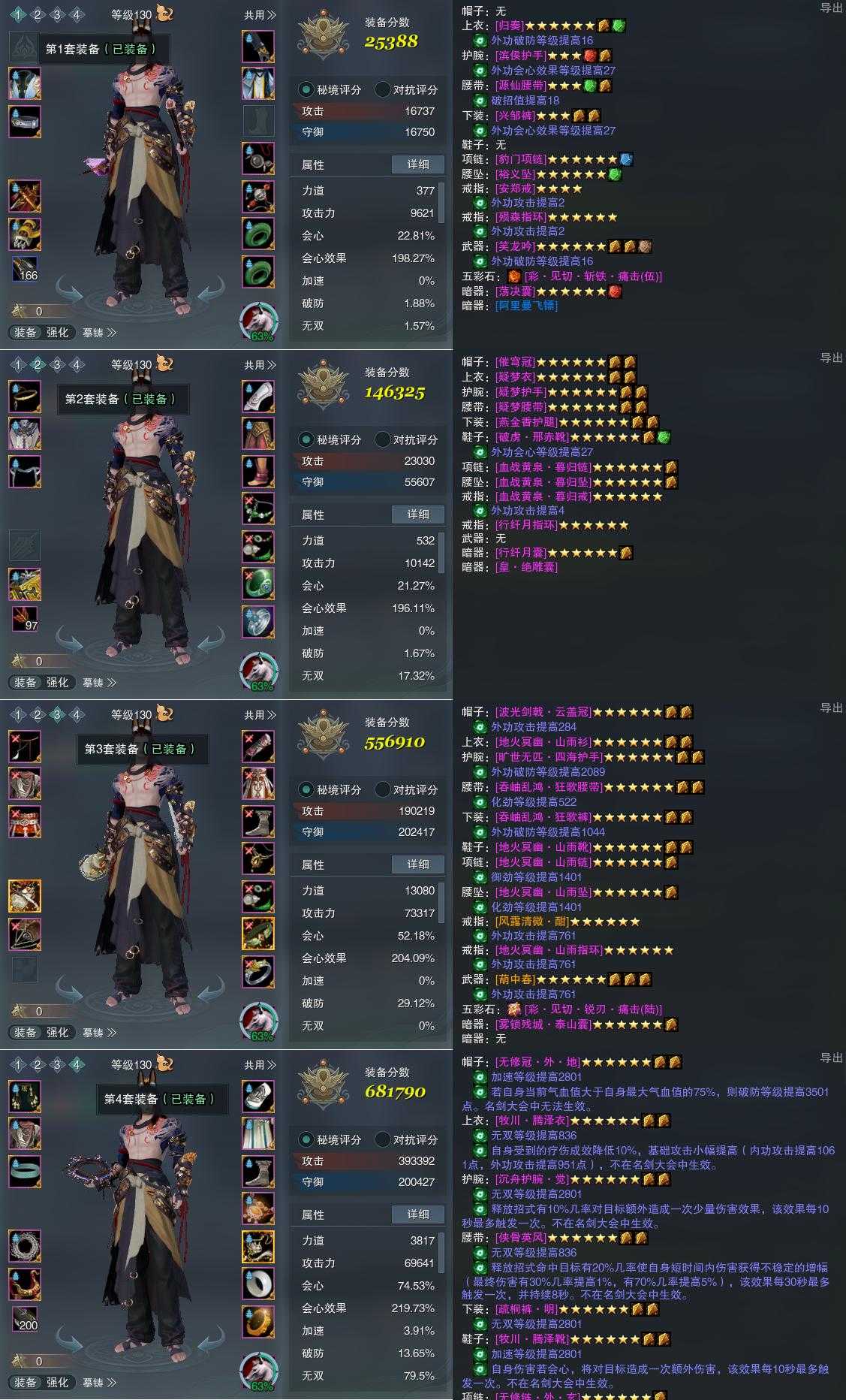 【装备】130级,装备一25388,装备二146325,笑尘诀装备三556910,笑尘诀PVE681790