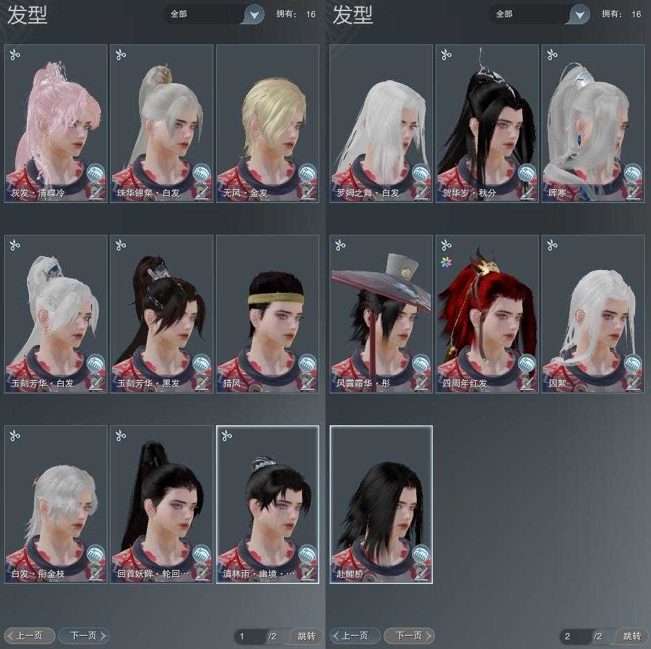 【发型】金发1个[无风金发], 红发2个[四红, 蝶粉], 黑发8个, 白发6个, 盒子发型[黑傣族黑发, 红黑妖眸盒黑发], 总页数2
