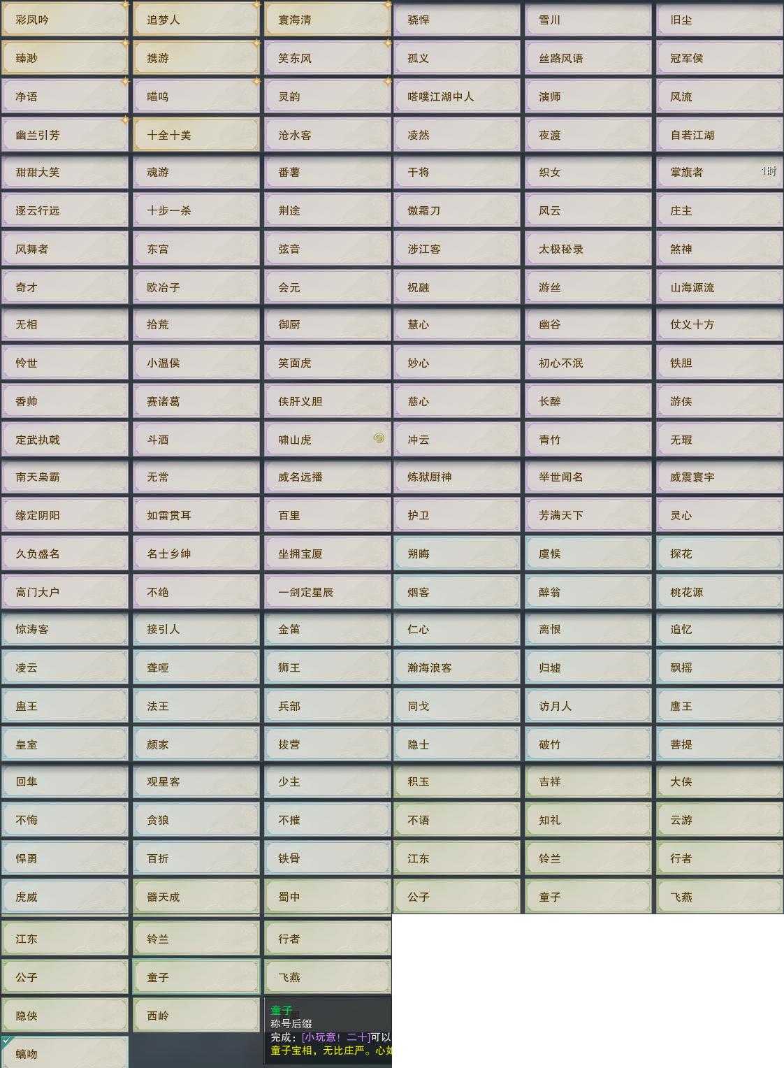 【奇珍】32个[枫林酒, 归乡路, 孩童书, 稚子心, 滇南行, 破晓鸣, 北行镖, 戎马边, 烹调法, 锋芒展]