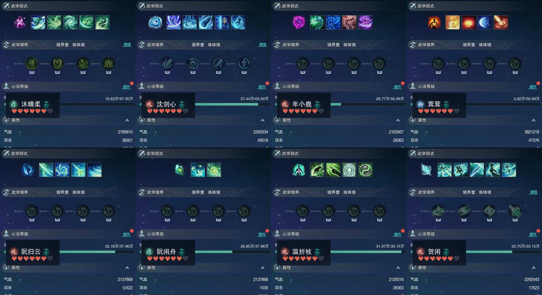 【同伴】沐晴柔84级境界壹,沈剑心82级境界壹,年小鹿80级境界壹,茸茸志80级境界壹,阮归云77级境界壹,阮闲舟77级境界壹,温折枝76级境界壹,贺闲志76级境界壹