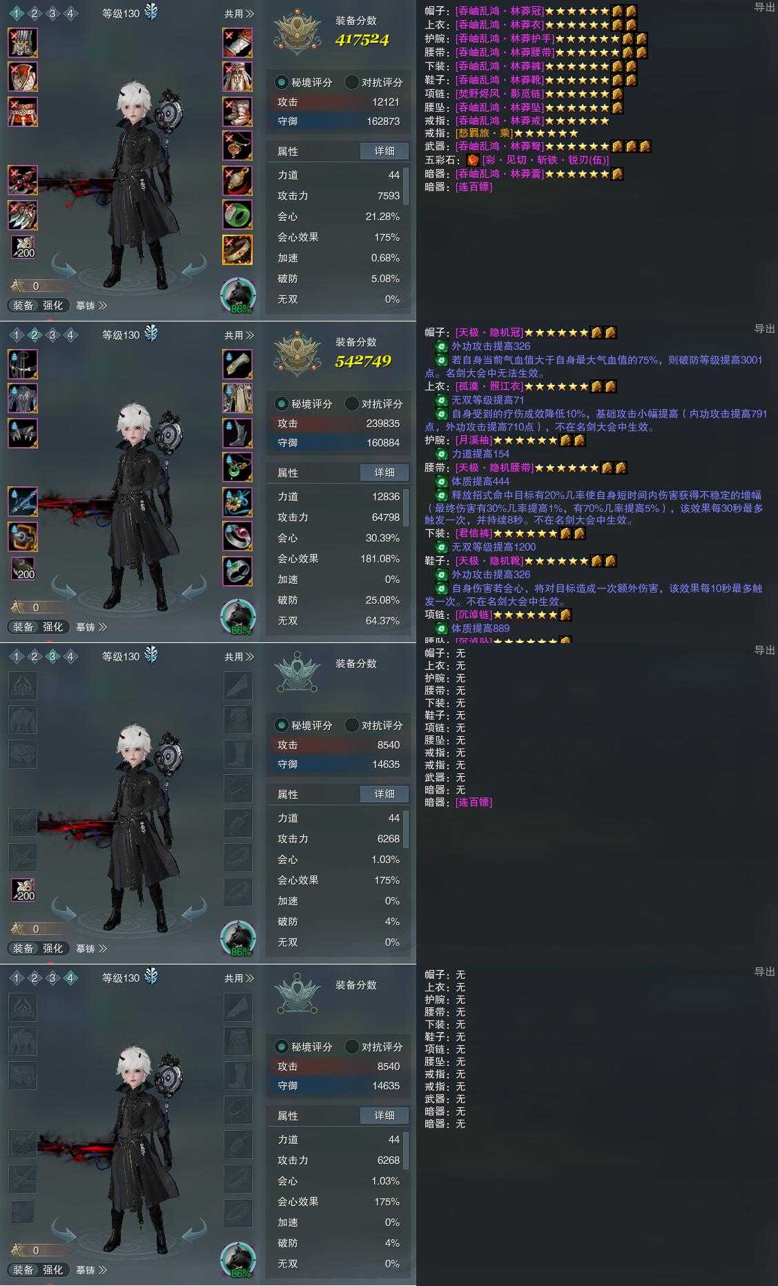【装备】130级,天罗诡道PVP417524,惊羽诀PVE542749,装备三0,装备四0