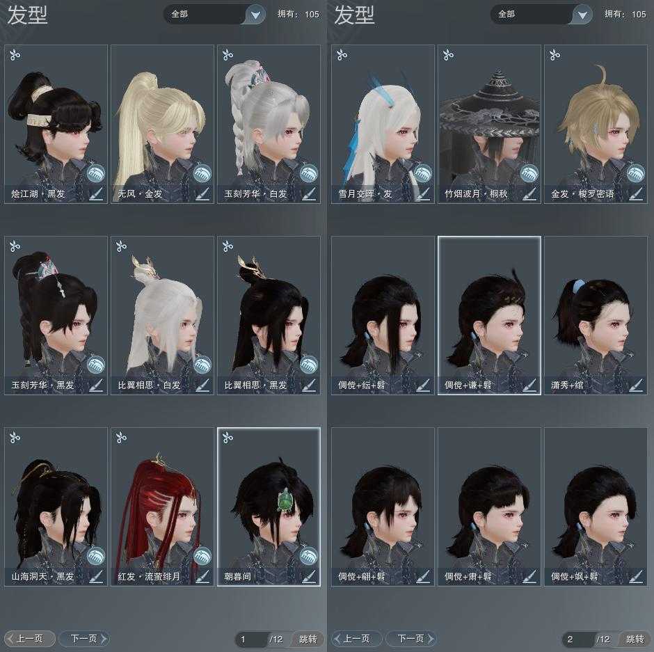 【发型】金发2个[资历金, 无风金发], 红发1个[小资历红], 黑发6个, 白发3个, 盒子发型[雪月白发, 五代七夕黑发, 五代七夕白发], 总页数2