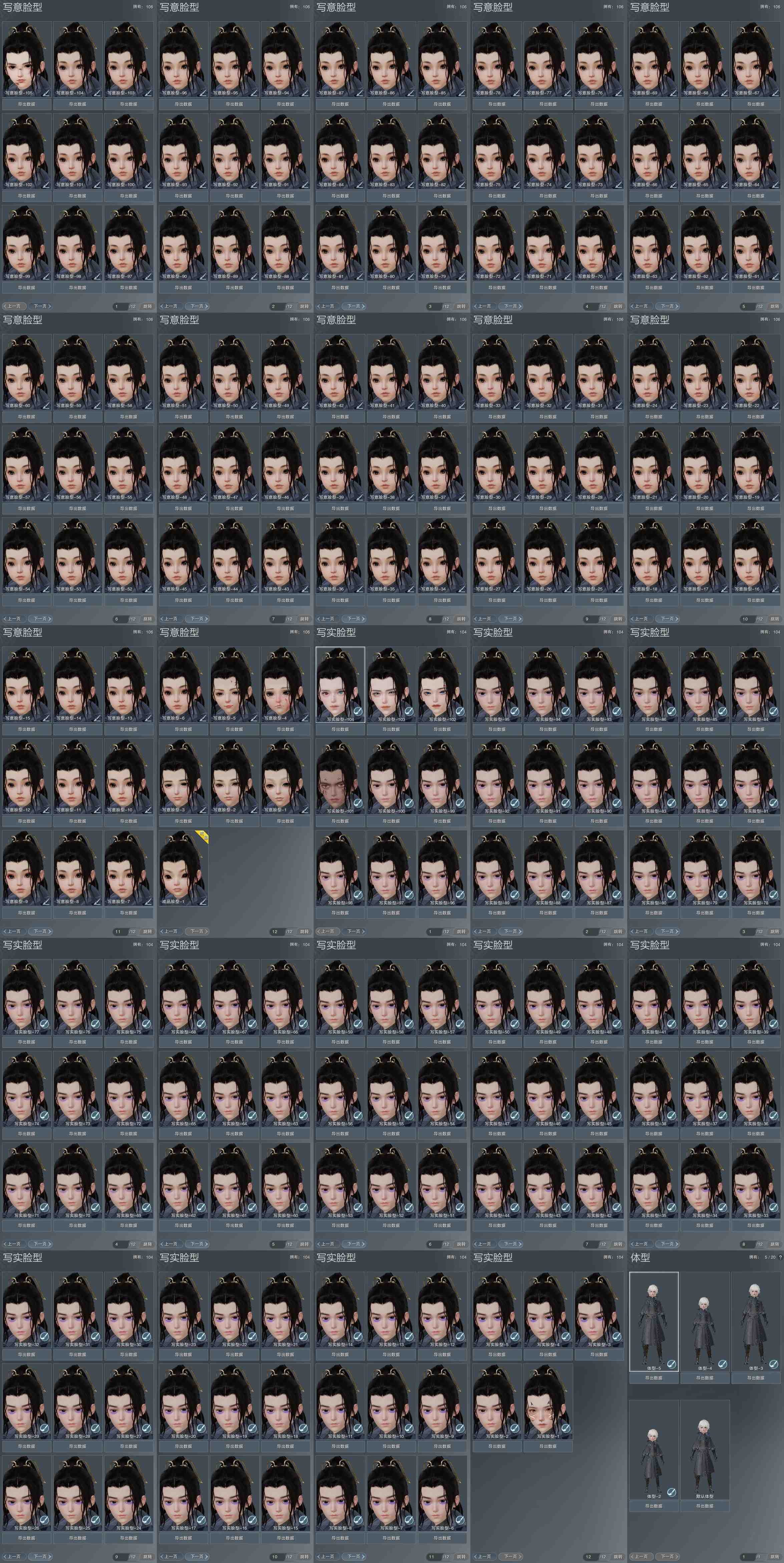 【捏脸】写意脸型106个,写实脸型104个,体型5个
