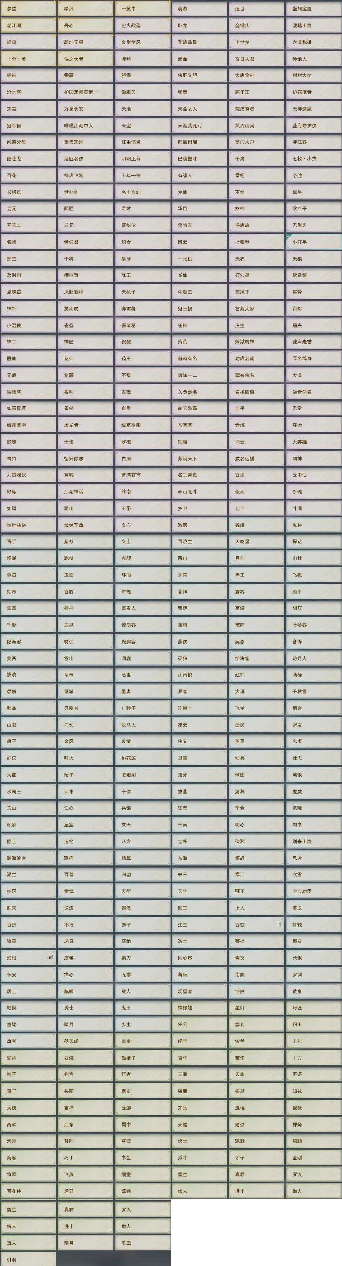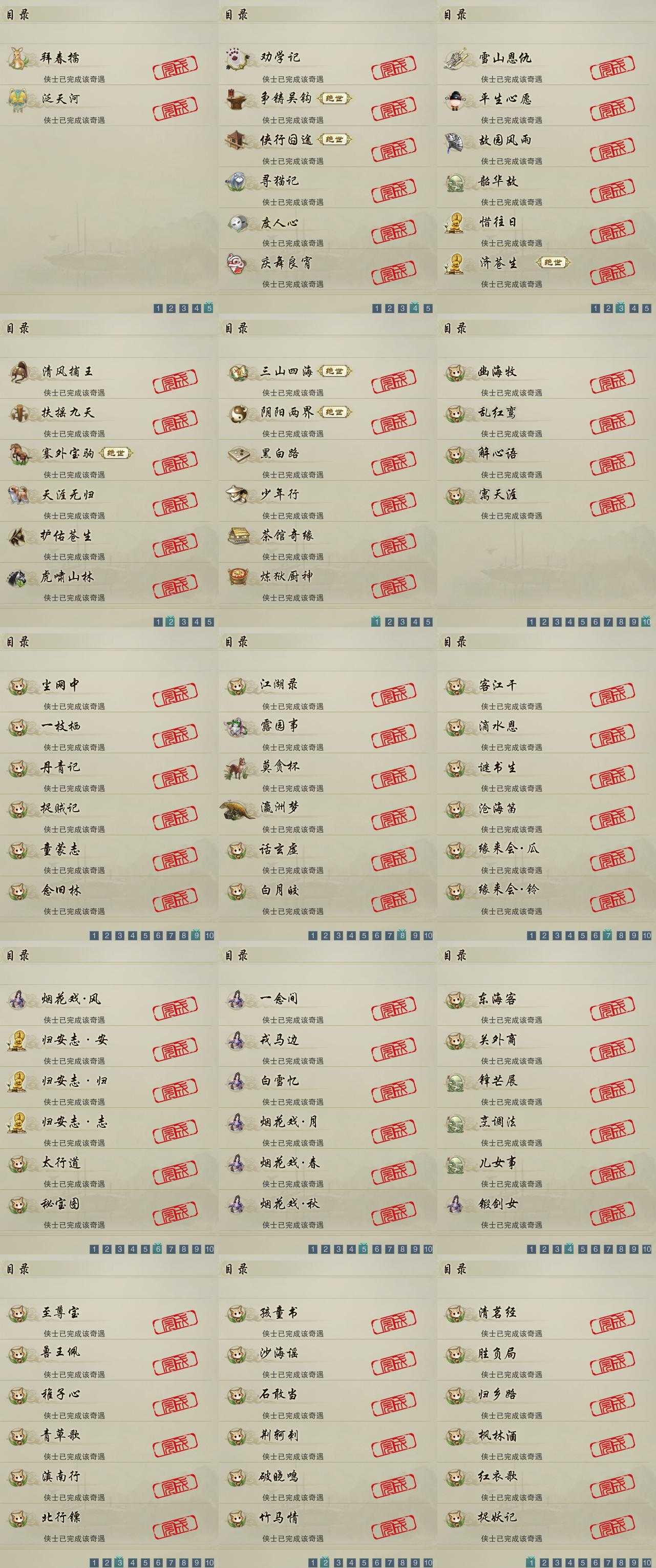 【奇遇】26个[天涯无归, 三山四海, 劝学记, 雪山恩仇, 阴阳两界, 平生心愿, 黑白路, 惜往日, 塞外宝驹, 争铸吴钩, 韶华故, 虎啸山林, 济苍生, 护佑苍生, 少年行, 故园风雨, 扶摇九天, 清风捕王, 侠行囧途, 寻猫记, 茶馆奇缘, 庆舞良宵, 炼狱厨神, 度人心, 泛天河, 拜春擂]