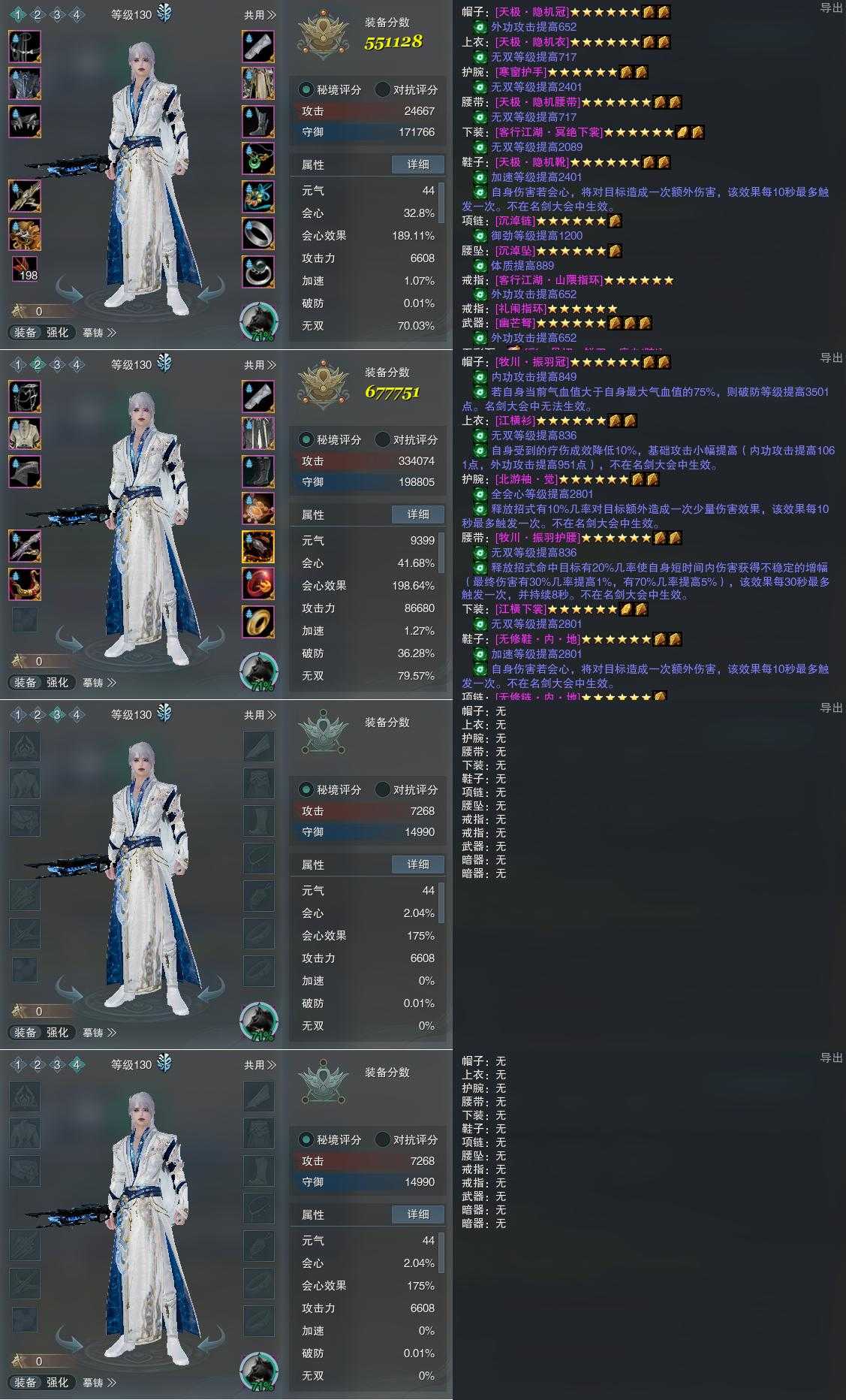 【装备】130级,惊羽诀PVE551128,天罗诡道PVE677751,装备三0,装备四0