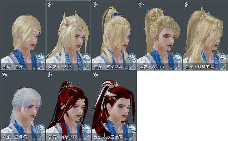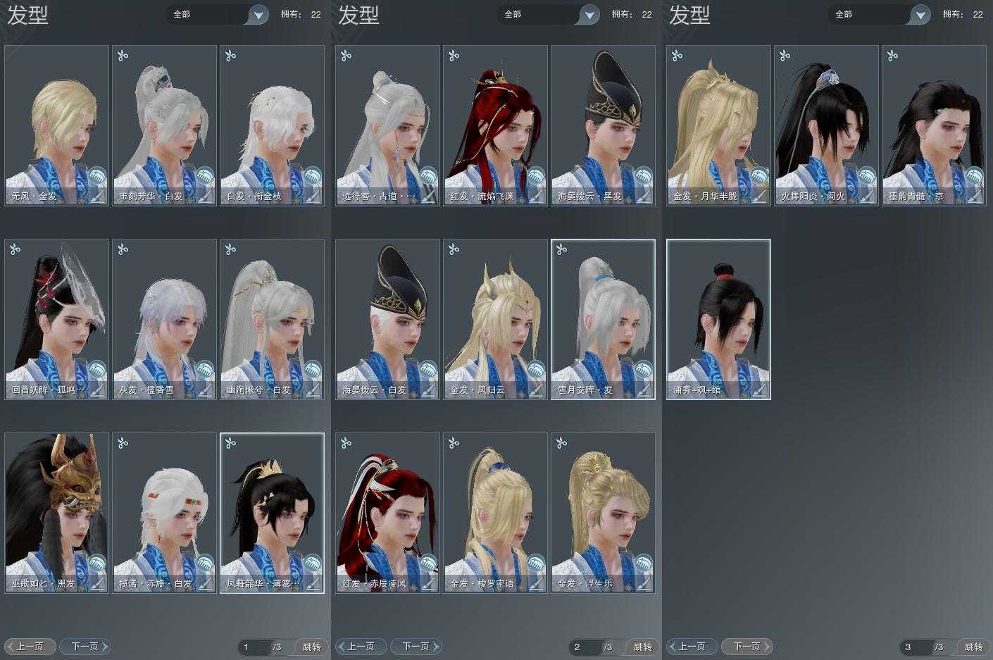 【发型】金发6个[资历金, 鸡金, 喵金, 狗金, 龙女金, 无风金发], 红发5个[八红, 九红, 兔红, 小资历红, 一代灰], 黑发11个, 白发9个, 盒子发型[狄仁杰黑, 一代花朝绿白, 狄仁杰白, 雪月白发, 薄雾黑发, 巫歌如匕黑发, 红懒猪白发, 七七白发, 幽涧愀兮白发, 红白妖眸盒黑发], 总页数3