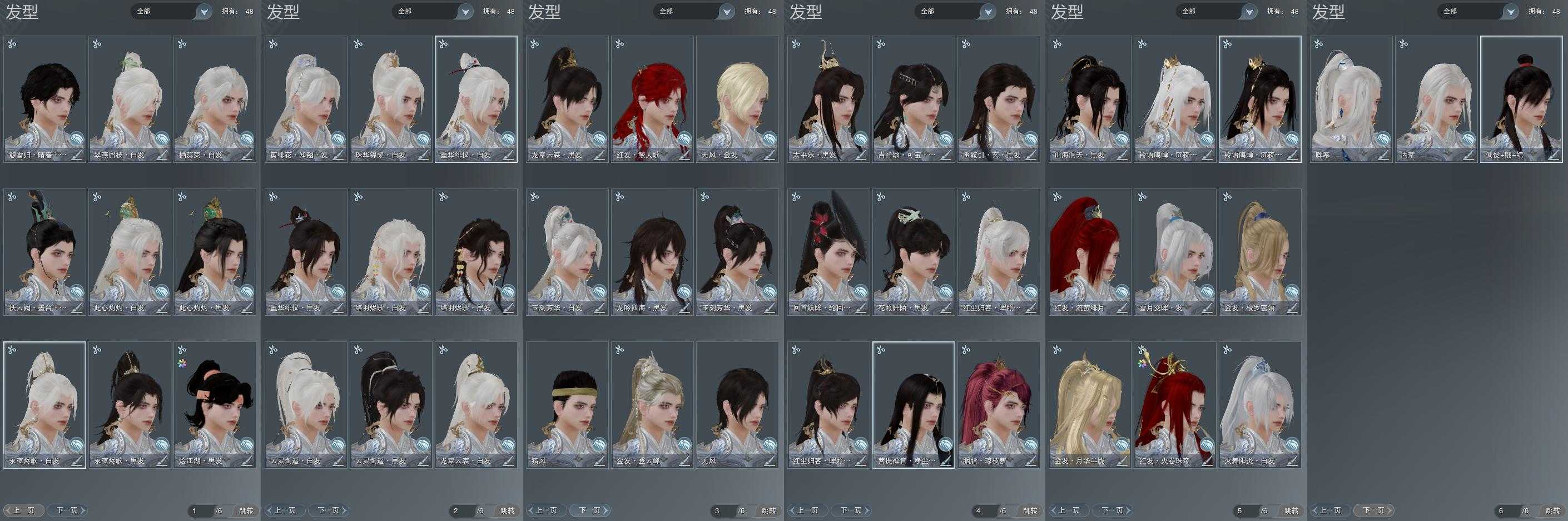 【发型】金发4个[资历金, 鸡金, 三代金, 无风金发], 红发4个[六红, 紫发, 小资历红, 十五红], 黑发22个, 白发17个, 盒子发型[雪月白发, 黑楼兰黑发, 黑楼兰白发, 净尘黑发, 黑红尘黑发, 黑红尘白发, 踏青黑发, 红黑妖眸盒黑发, 黑幽馥黑发, 黑藏袍黑发, 龙吟盒黑发, 墨龙盒黑发, 墨龙盒白发, 仙剑黑发, 络羽黑发, 傀儡黑发, 仙剑白发, 络羽白发, 傀儡白发, 十七黑发, 黑战国黑发, 十七白发, 红毛衣黑发], 总页数6