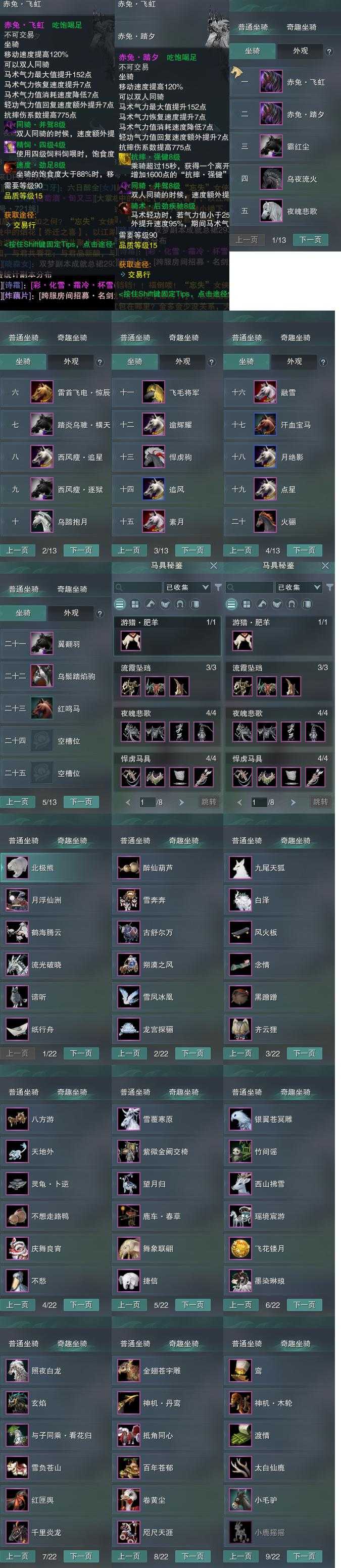 【坐骑】23个[踏炎横天, 西风瘦逐狱, 西风瘦追星, 飞毛将军, 乌蹄抱月, 劲足赤兔飞虹, 赤兔踏夕, 黑翅马, 霸红尘, 雷首飞电惊辰, 乌鬃踏焰驹]