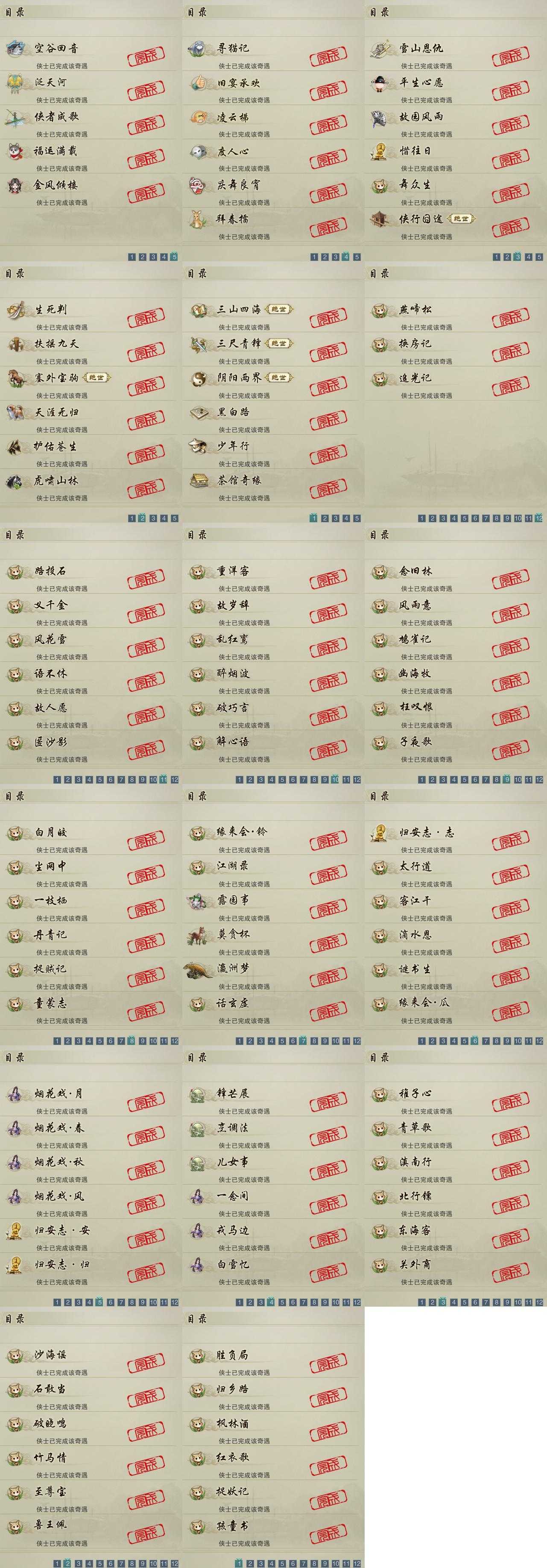 【奇遇】29个[天涯无归, 三山四海, 雪山恩仇, 阴阳两界, 平生心愿, 黑白路, 惜往日, 塞外宝驹, 虎啸山林, 护佑苍生, 少年行, 故园风雨, 扶摇九天, 三尺青锋, 舞众生, 寻猫记, 侠行囧途, 茶馆奇缘, 庆舞良宵, 生死判, 凌云梯, 度人心, 空谷回音, 旧宴承欢, 泛天河, 侠者成歌, 拜春擂, 福运满载, 金风倾楼]