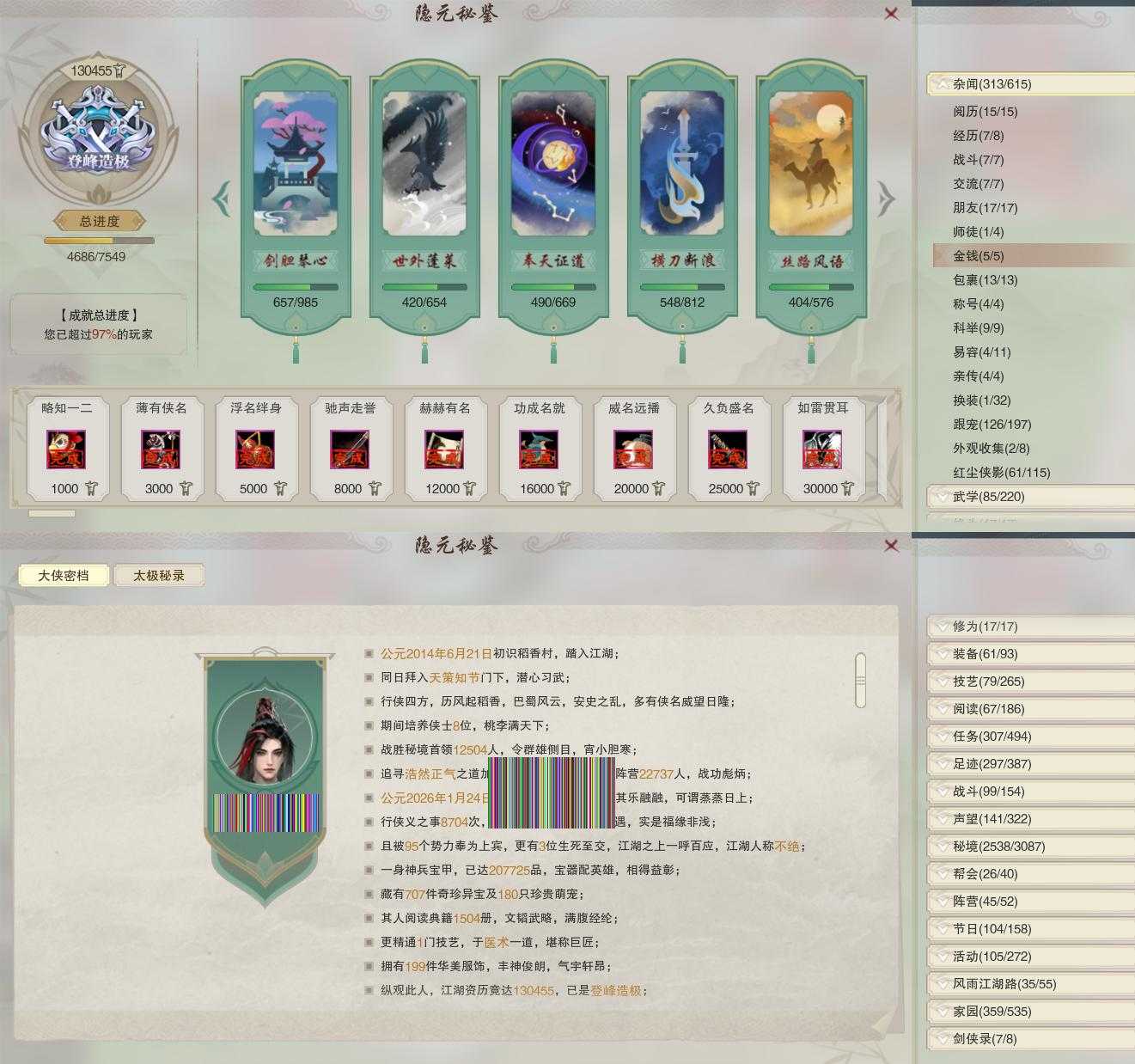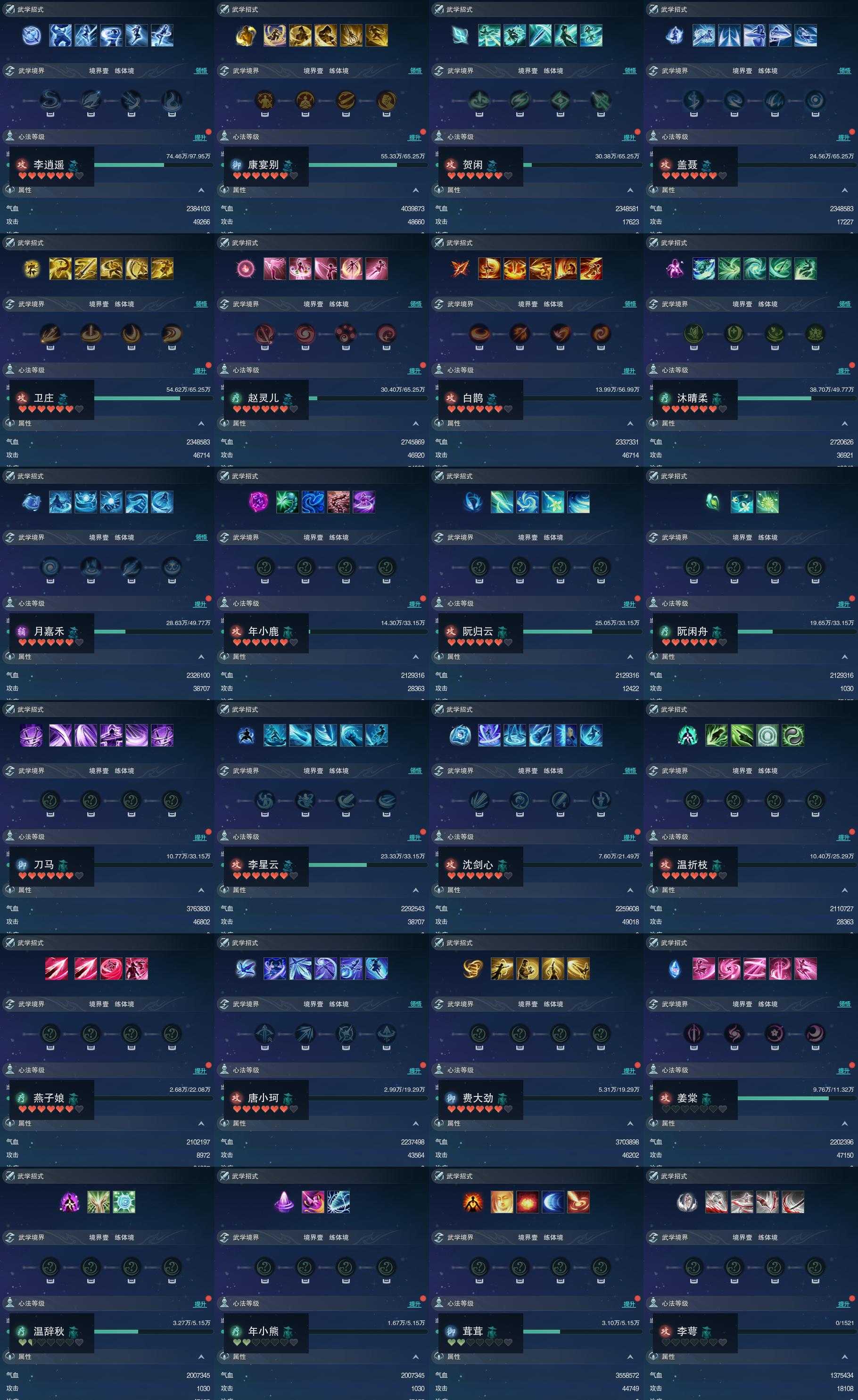 【同伴】李逍遥84级境界壹,康宴别81级境界壹,贺闲意81级境界壹,盖聂81级境界壹,卫庄意81级境界壹,赵灵儿81级境界壹,白鹊慈80级境界壹,沐晴柔79级境界壹,月嘉禾79级境界壹,年小鹿76级境界壹,阮归云76级境界壹,阮闲舟76级境界壹,刀马志76级境界壹,李星云76级境界壹,沈剑心74级境界壹,温折枝74级境界壹,燕子娘73级境界壹,唐小珂72级境界壹,费大劲72级境界壹,姜棠志68级境界壹,温辞秋62级境界壹,年小熊62级境界壹,茸茸志62级境界壹,李萼志1级境界壹