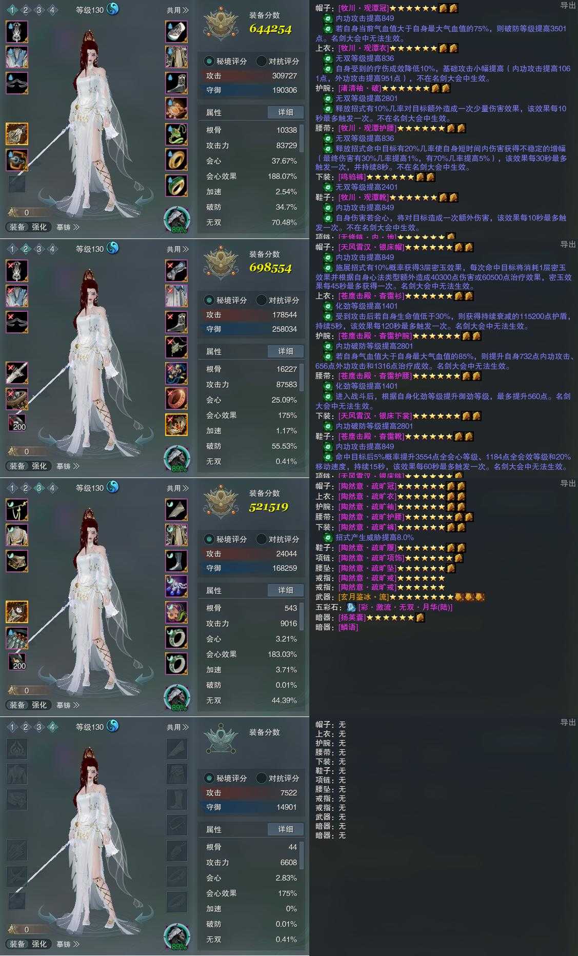 【装备】130级,紫霞功PVE644254,紫霞功PVP698554,太虚剑意PVP521519,装备四0