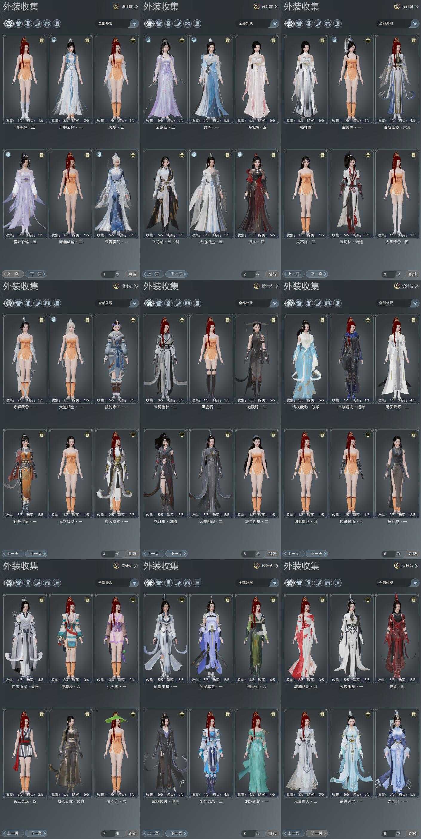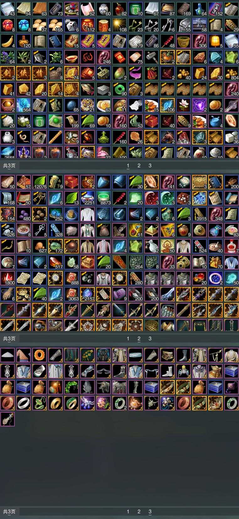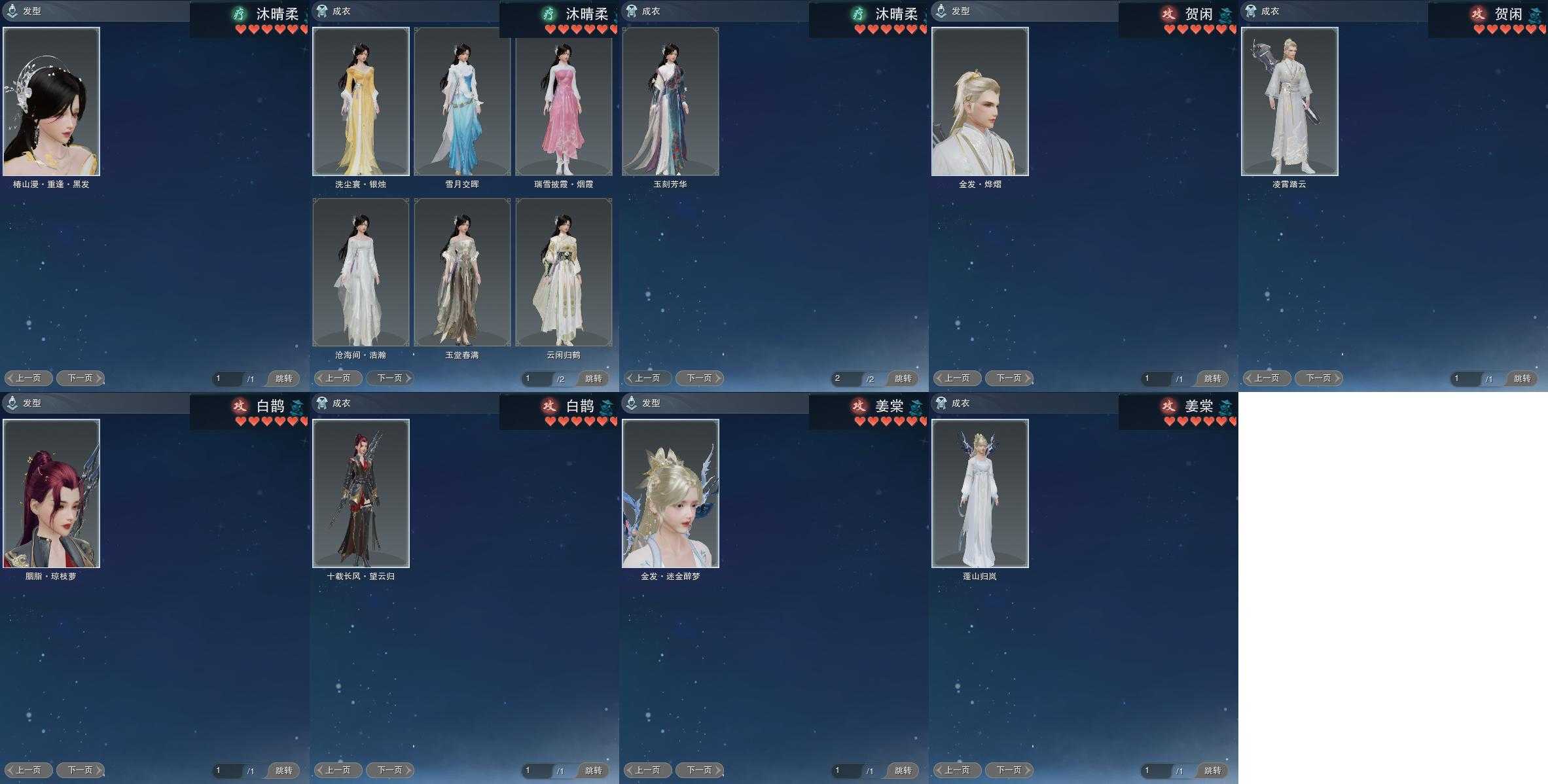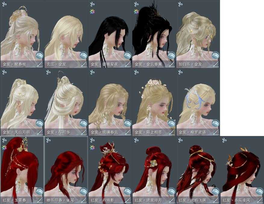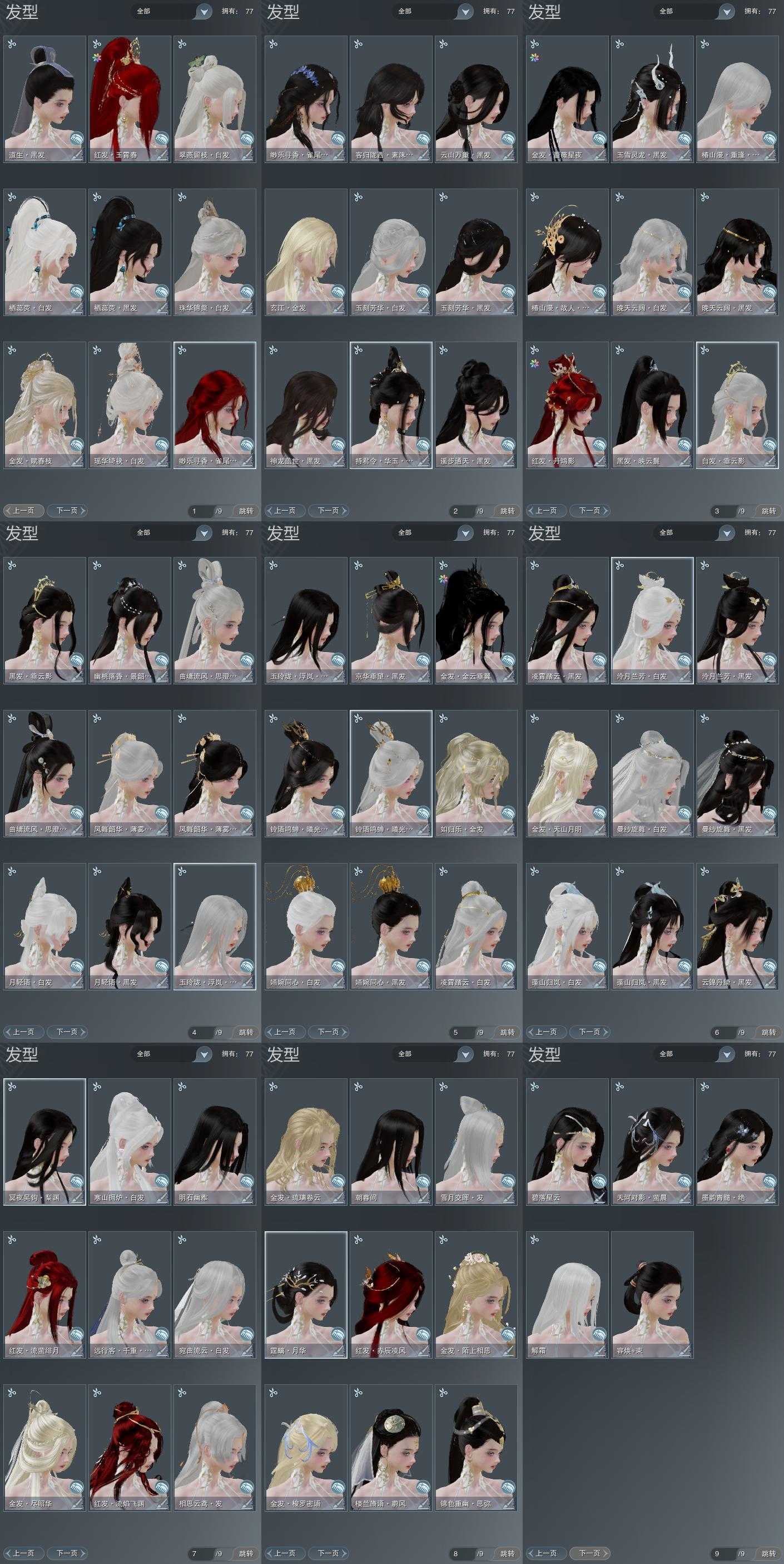 【发型】金发12个[资历金, 中秋金, 考金, 龙女金, 猪金, 丝路金, 苍金, 如归金, 牛金, 蔷薇金, 玄江金发, 蛇金], 红发7个[八红, 九红, 紫发, 虎红, 小资历红, 蓝寻香红发, 马红], 黑发38个, 白发23个, 盒子发型[二代花朝黑, 丝路黑, 泠月黑发, 踏云黑发, 四代七夕黑发, 二代重阳白, 三代七夕白, 雪月白发, 棉袄白, 白楼兰黑发, 二代花朝白, 丝路白, 泠月白发, 踏云白发, 四代七夕白发, 白楼兰白发, 浮岚黑发, 月轻语黑发, 薄雾黑发, 红曲塘黑, 浮岚白发, 月轻语白发, 薄雾白发, 红曲塘白, 蓝幽香黑发, 黑椿山黑发, 蓝椿山黑发, 灵龙盒黑发, 蓝椿山白发, 西游盒黑发, 白持君盒黑发, 熊猫黑发, 蓝陇西黑发, 蓝寻香黑发, 瑶华盒白发], 总页数9