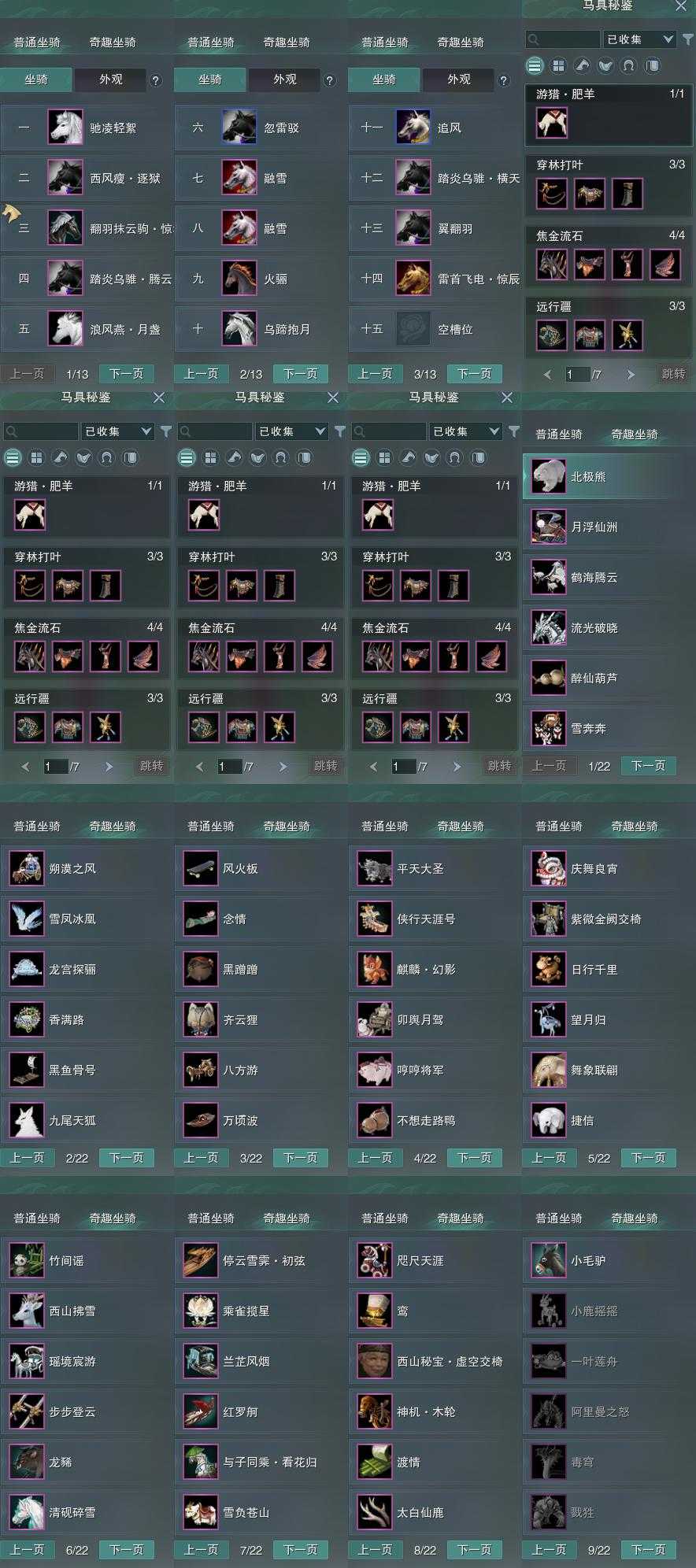 【坐骑】14个[踏炎横天, 踏炎腾云, 西风瘦逐狱, 翻羽抹云驹惊华, 乌蹄抱月, 雪马, 雷首飞电惊辰]