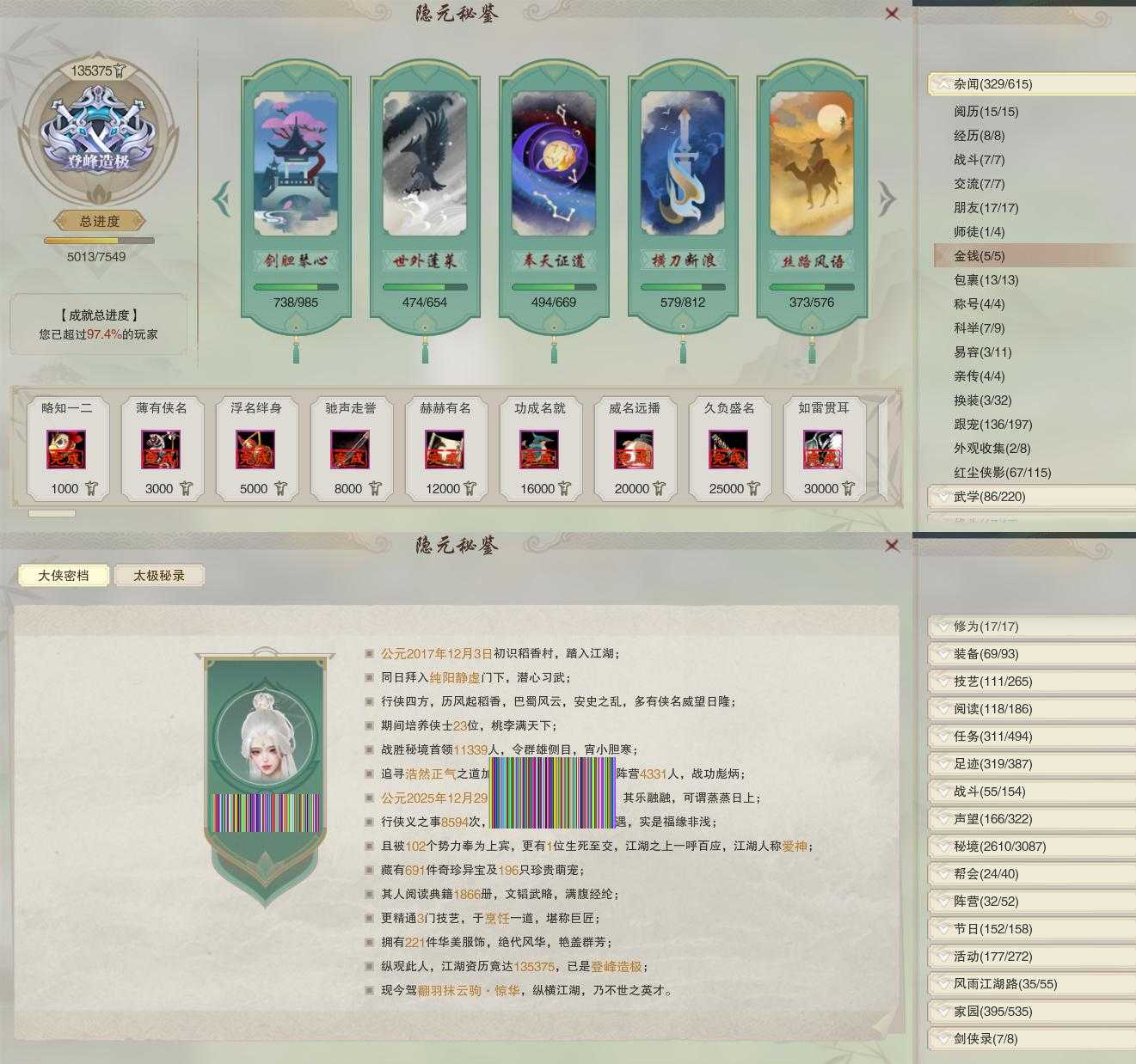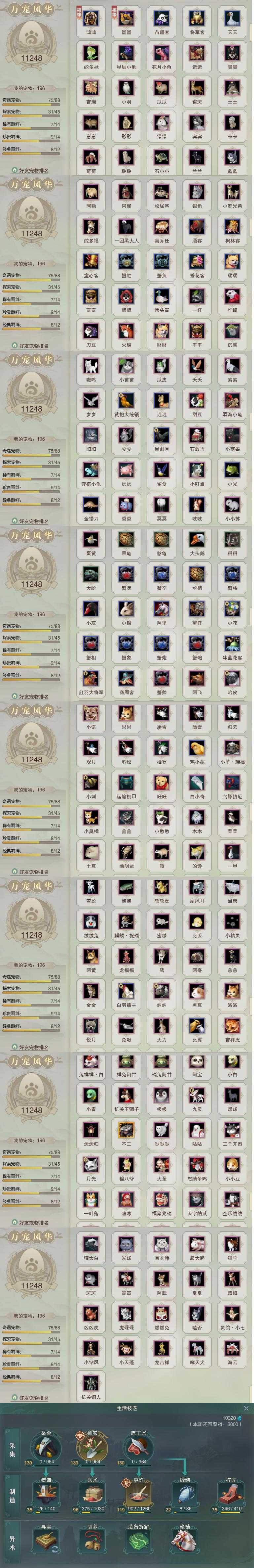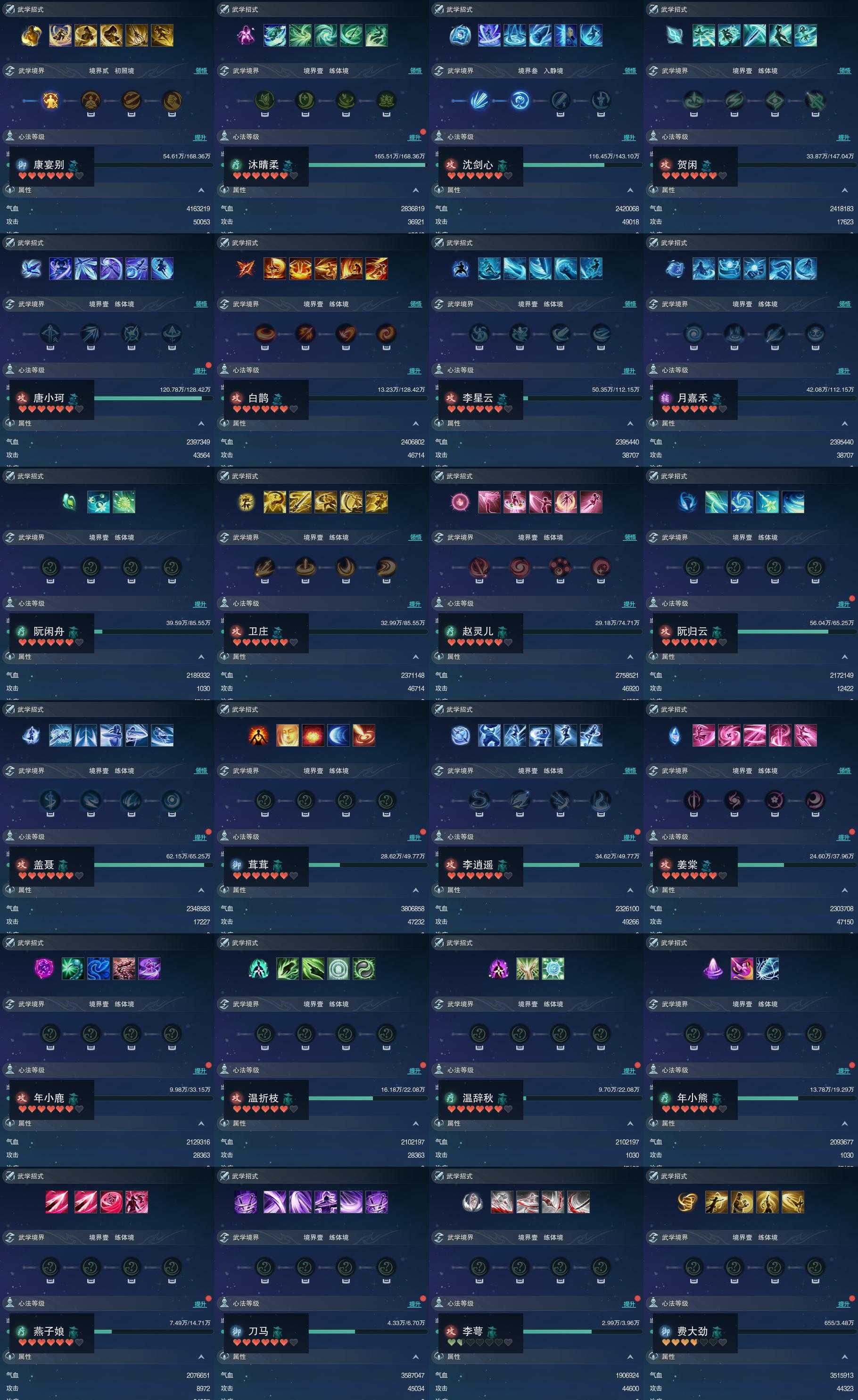 【同伴】康宴别88级境界贰,沐晴柔88级境界壹,沈剑心88级境界叁,贺闲意87级境界壹,唐小珂86级境界壹,白鹊慈86级境界壹,李星云85级境界壹,月嘉禾85级境界壹,阮闲舟83级境界壹,卫庄意83级境界壹,赵灵儿82级境界壹,阮归云81级境界壹,盖聂志81级境界壹,茸茸志79级境界壹,李逍遥79级境界壹,姜棠意77级境界壹,年小鹿76级境界壹,温折枝73级境界壹,温辞秋73级境界壹,年小熊72级境界壹,燕子娘70级境界壹,刀马志64级境界壹,李萼志60级境界壹,费大劲59级境界壹