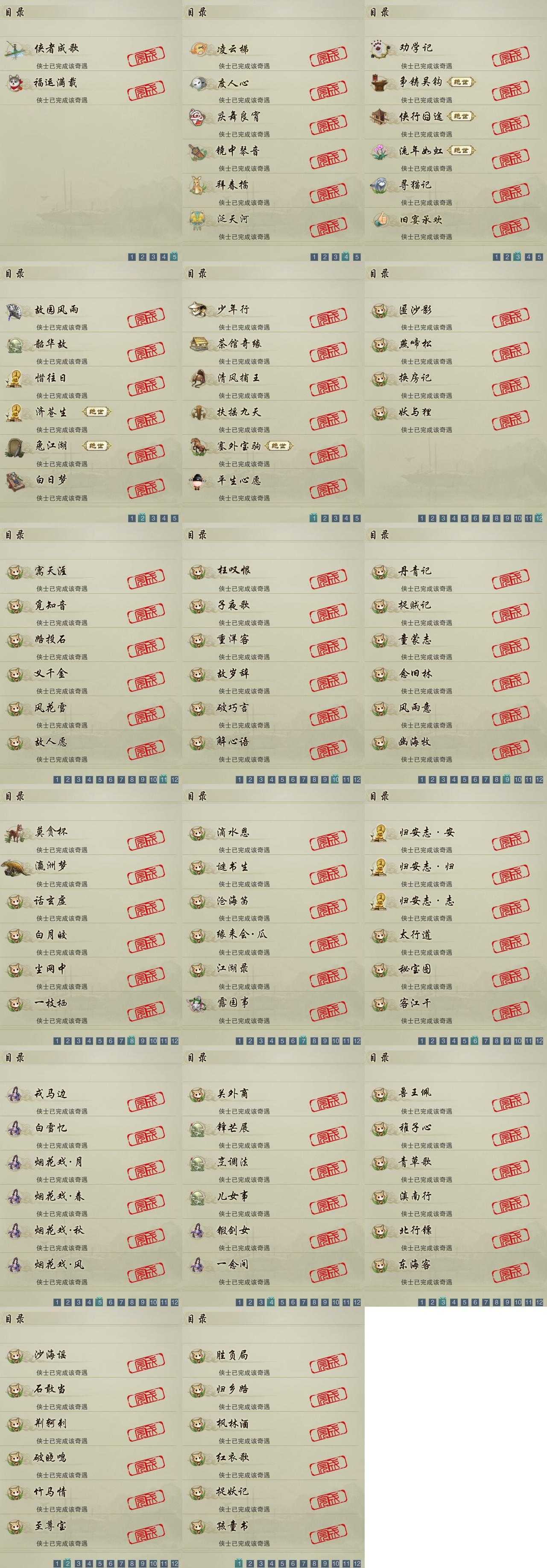 【奇遇】26个[白日梦, 劝学记, 兔江湖, 平生心愿, 惜往日, 塞外宝驹, 争铸吴钩, 韶华故, 济苍生, 少年行, 故园风雨, 扶摇九天, 流年如虹, 清风捕王, 侠行囧途, 寻猫记, 茶馆奇缘, 庆舞良宵, 凌云梯, 度人心, 旧宴承欢, 镜中琴音, 泛天河, 侠者成歌, 拜春擂, 福运满载]