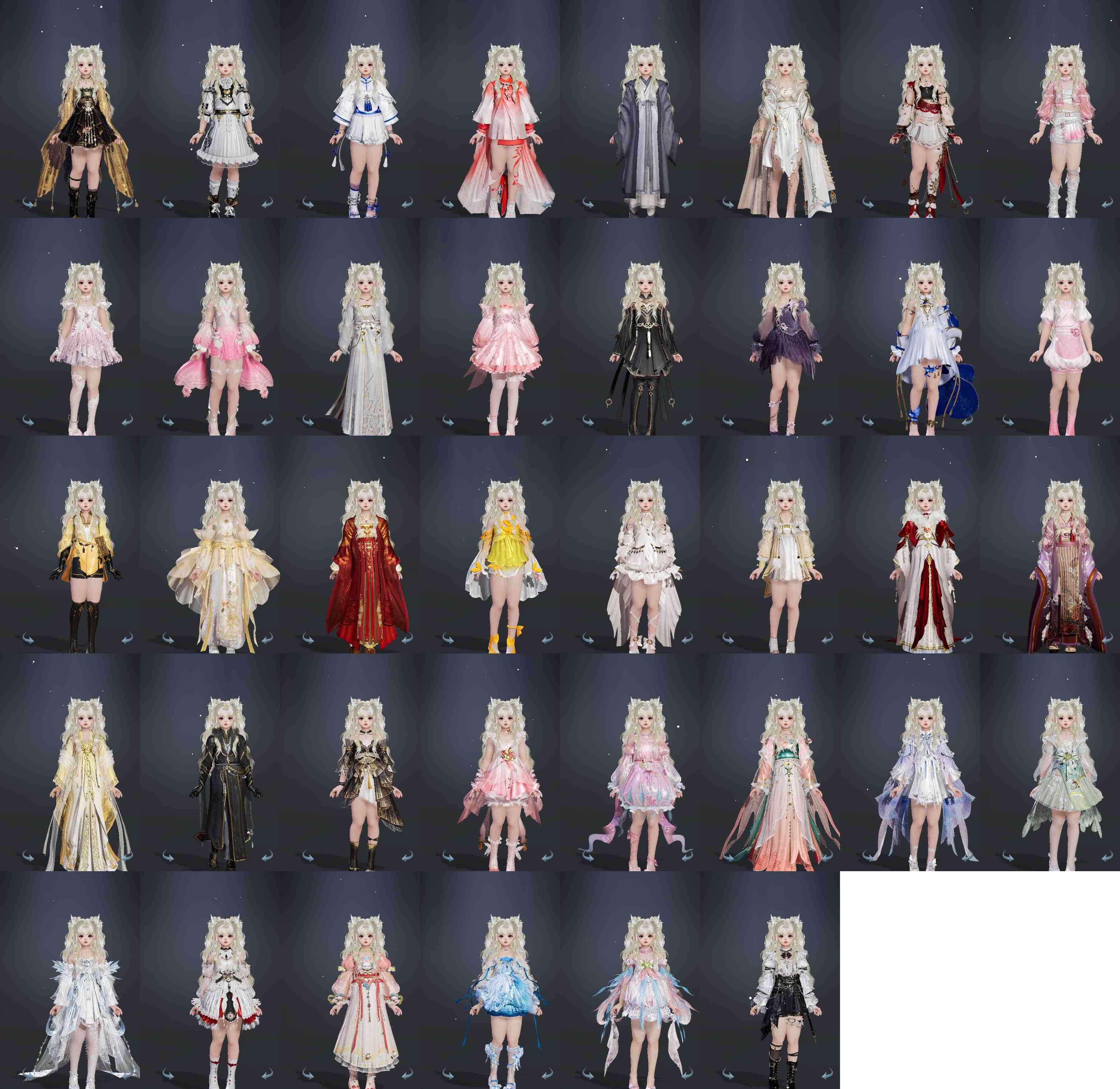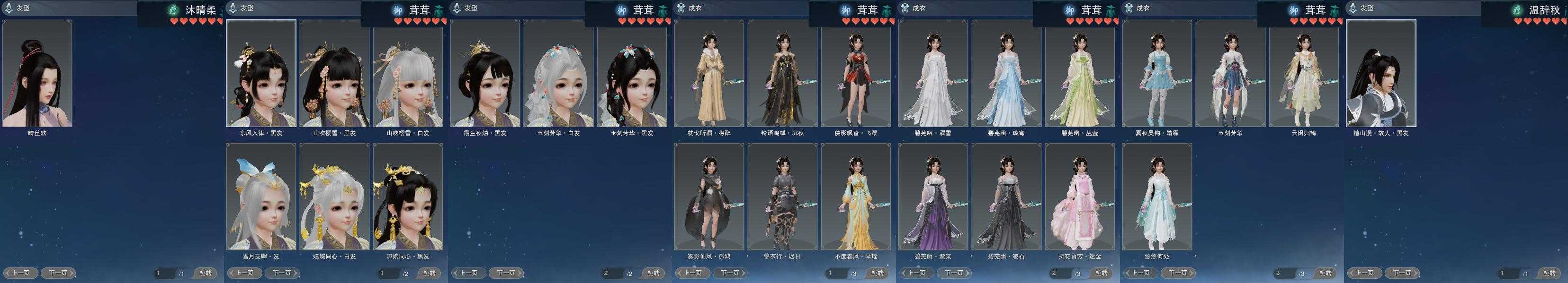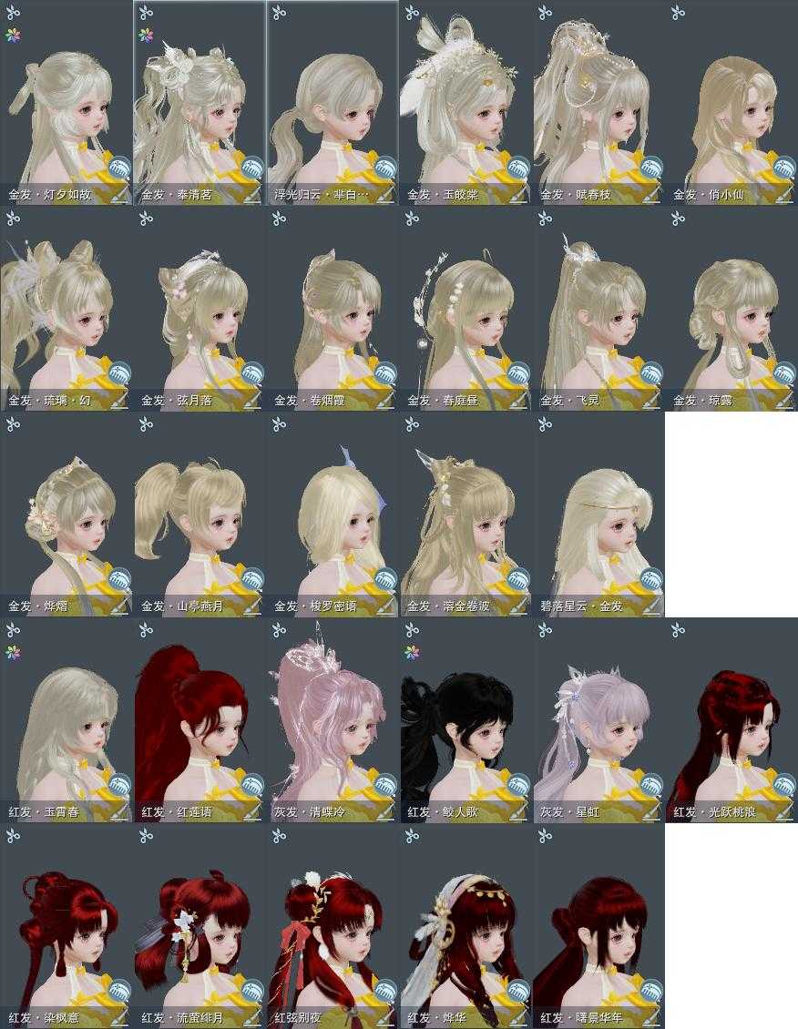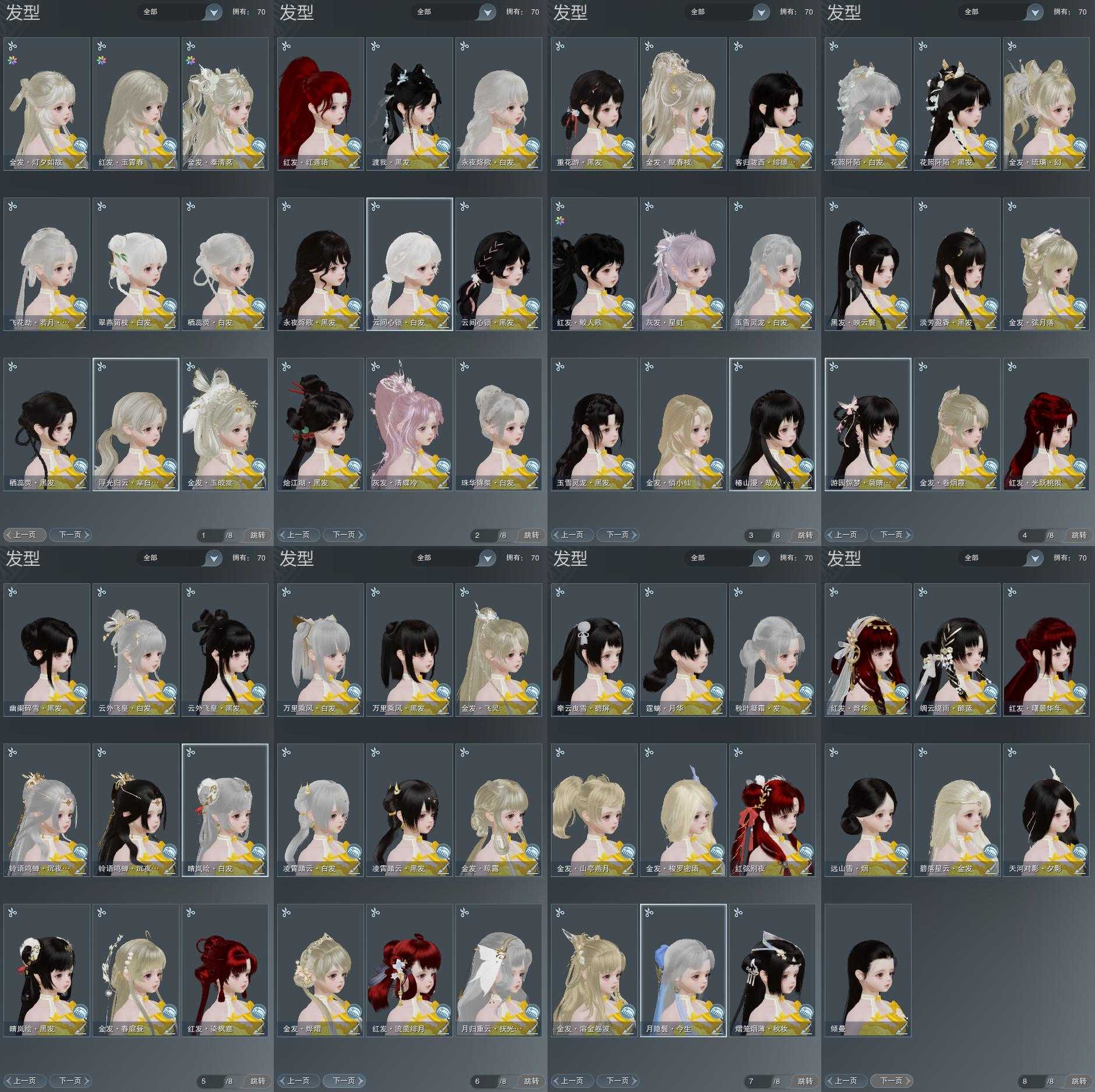 【发型】金发17个[资历金, 鼠金, 蝶金, 国金, 苏金, 猪金, 珊瑚金, 飒金, 角金, 巴卡金, 海金, 刺金, 蛇金, 七中金发, 金发奉清茗, 马金, 白浮光金发], 红发11个[七红, 十一红, 蝶粉, 猴红, 鸡红, 鼠红, 小资历红, 十五红, 十六红, 马红, 二代灰], 黑发31个, 白发20个, 盒子发型[一代蓝中秋白, 一代重阳白, 踏云黑发, 四代七夕黑发, 狗白, 乘风黑发, 晴岚绘黑发, 雪月白发, 山吹樱雪黑发, 黑楼兰黑发, 踏云白发, 四代七夕白发, 飞皇黑发, 幽阑黑发, 乘风白发, 晴岚绘白发, 山吹樱雪白发, 黑楼兰白发, 飞皇白发, 粉游园黑发, 六代中秋黑发, 除夕盒黑发, 黑椿山黑发, 踏青黑发, 灵龙盒黑发, 踏青白发, 灵龙白发, 粉陇西黑发, 重花游黑发, 云间盒黑发, 傀儡黑发, 渡我黑发, 云间盒白发, 傀儡白发], 总页数8