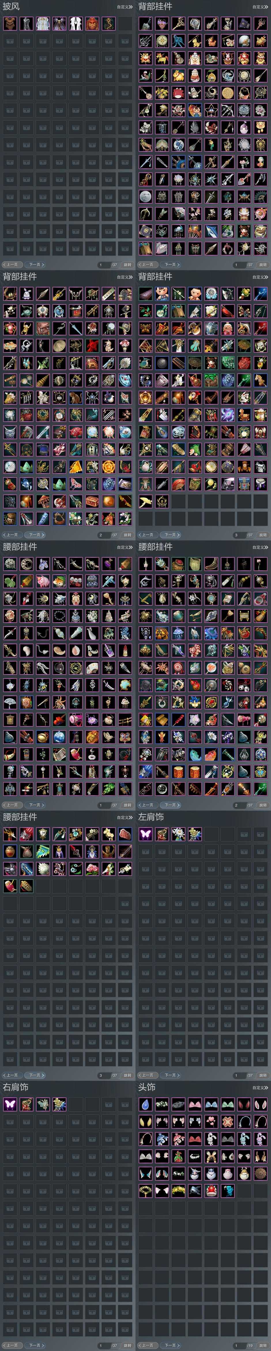 【背挂】322个[霜风云隐·烟霞, 红纶苍鬓, 石剑溟灵, 识妆, 春山绘樱扇, 黑楼兰伞, 雨怜菇, 踏青挂件, 灵龙盒子背挂, 瓷盒背挂, 云间背挂, 傀儡小熊]