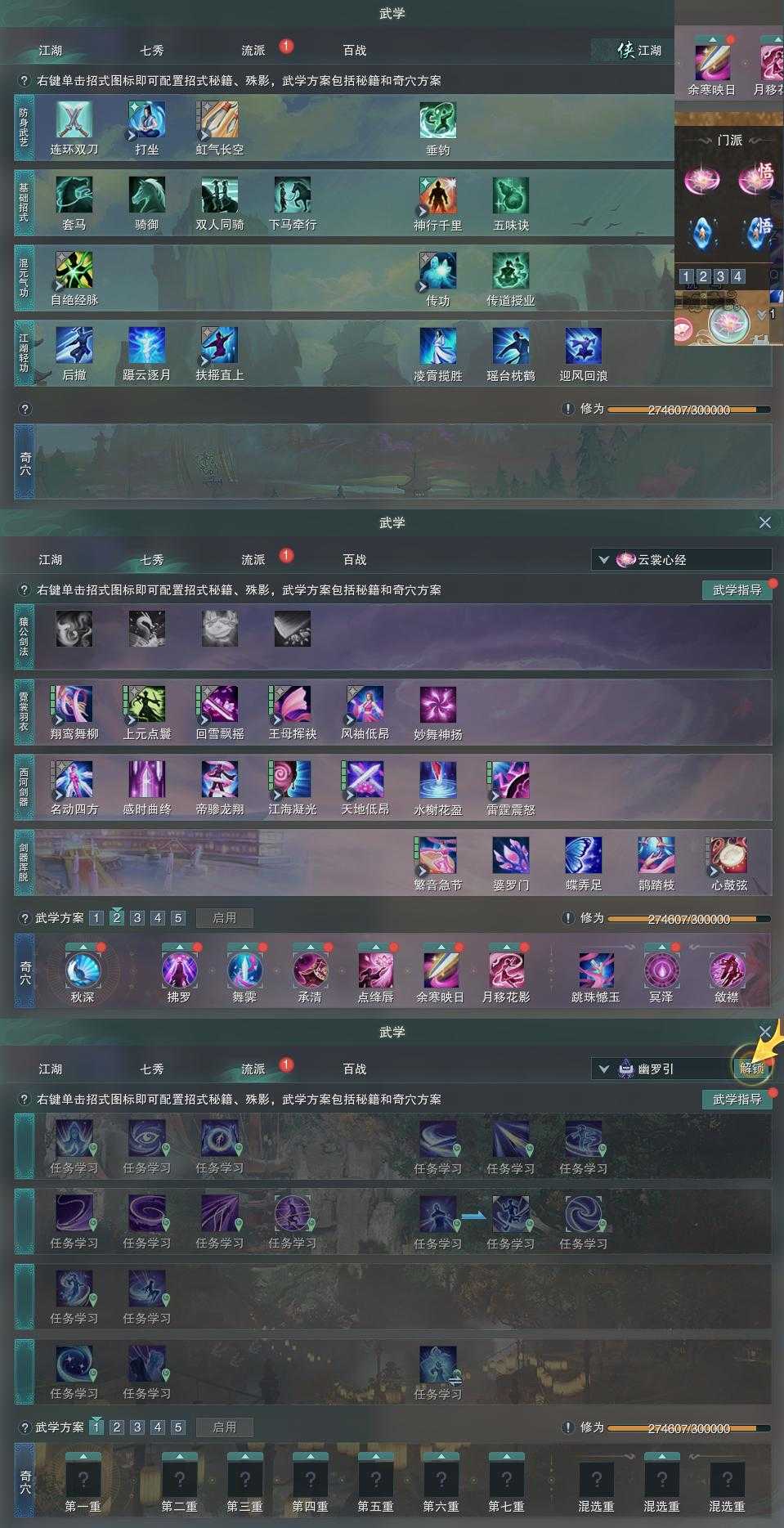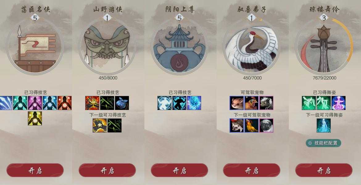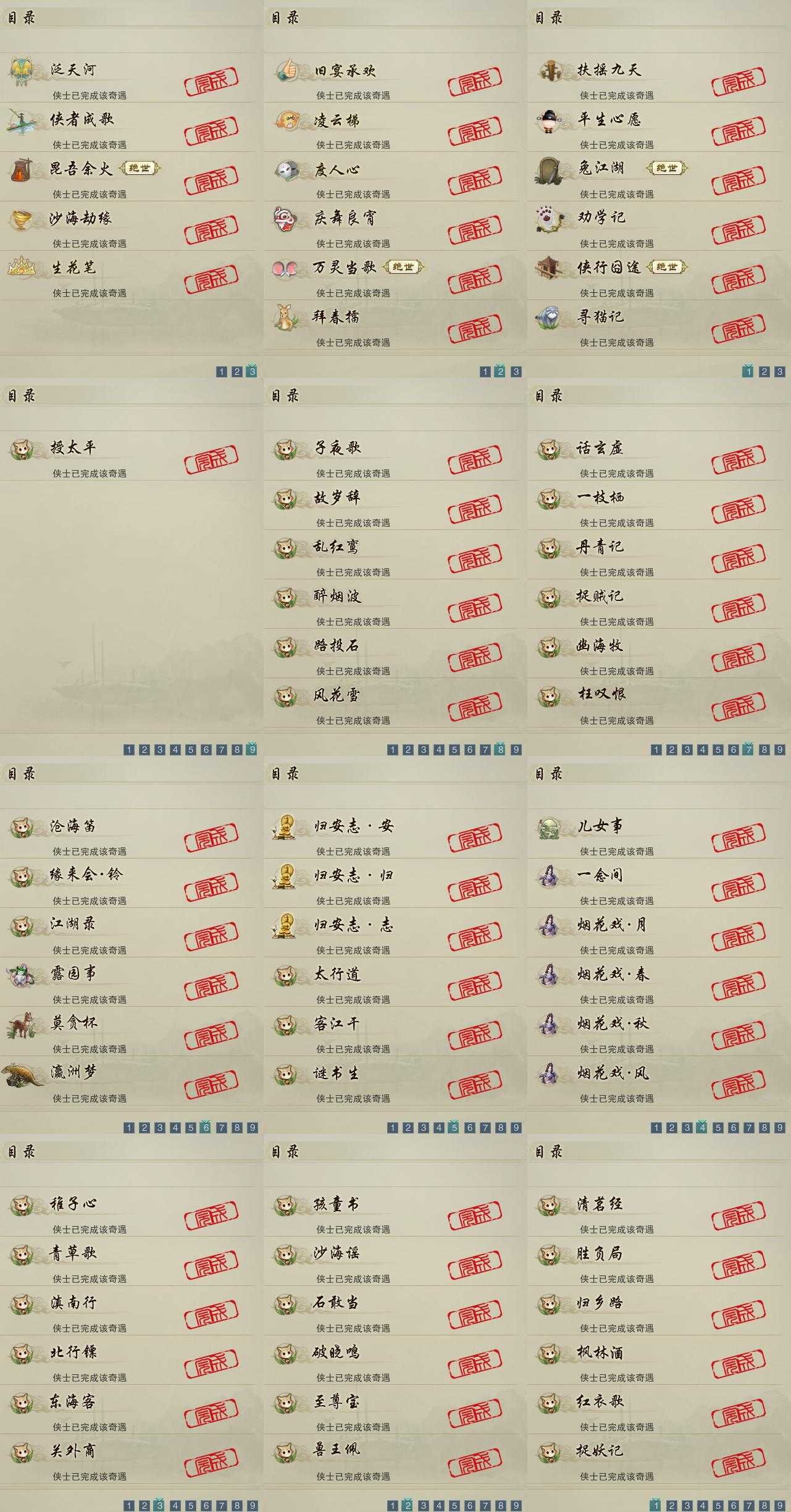 【奇遇】17个[劝学记, 平生心愿, 兔江湖, 扶摇九天, 侠行囧途, 寻猫记, 庆舞良宵, 万灵当歌, 凌云梯, 度人心, 旧宴承欢, 泛天河, 昆吾余火, 侠者成歌, 沙海劫缘, 拜春擂, 生花笔]