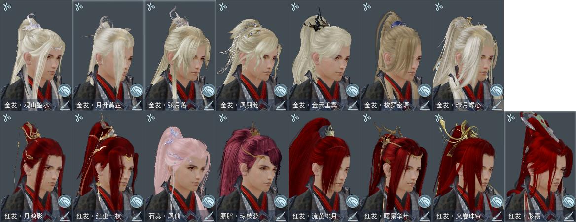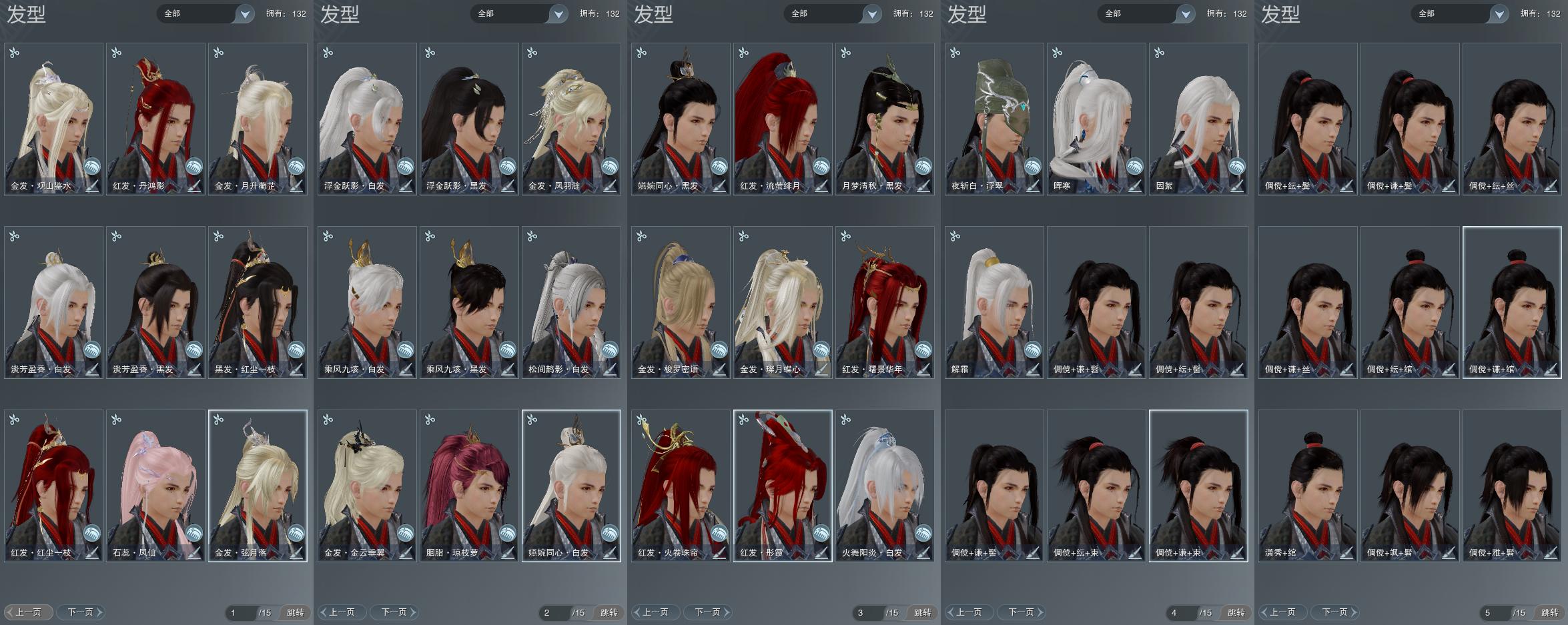 【发型】金发7个[狐金, 资历金, 苍金, 凤金, 巴卡金, 香蕉金, 呱金], 红发8个[六红, 十二红, 紫发, 凤仙粉, 羊红, 猴红, 虎红, 小资历红], 黑发7个, 白发9个, 盒子发型[四代七夕黑发, 四代七夕白发, 二代乘风黑发, 同人白发, 二代乘风白发, 小金龙黑发, 小金龙白发, 十二黑, 六代中秋黑发, 六代中秋白发], 总页数5
