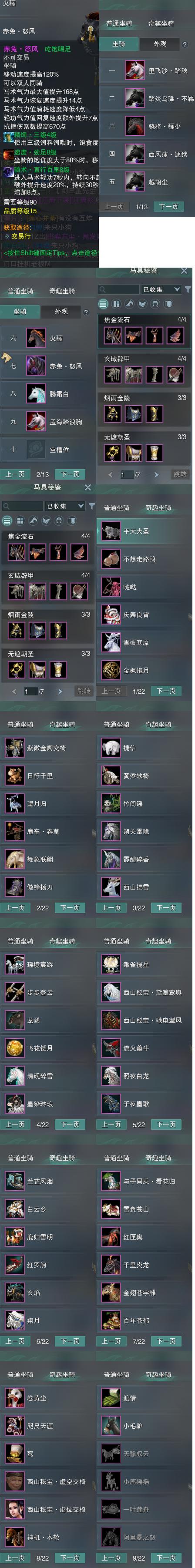 【坐骑】9个[踏炎不羁, 西风瘦逐狱, 里飞沙踏秋, 劲足赤兔怒风, 骁将骊少]