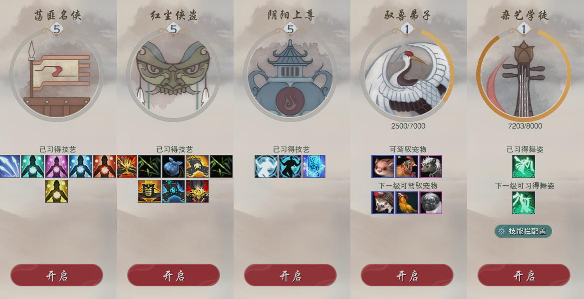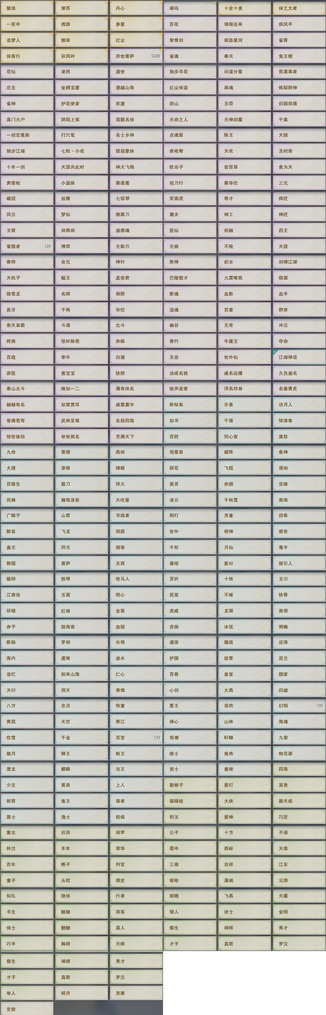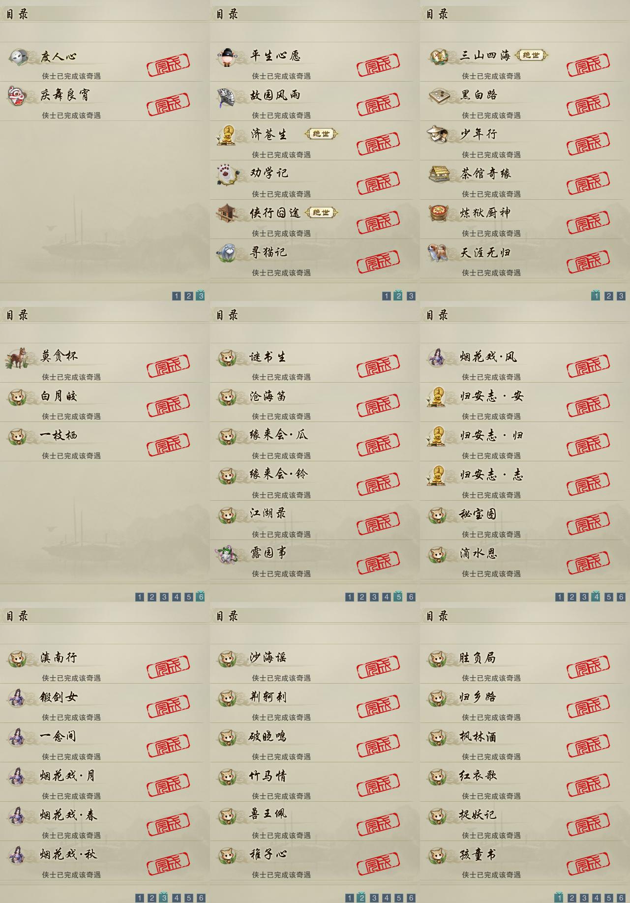 【奇遇】14个[三山四海, 天涯无归, 劝学记, 平生心愿, 黑白路, 济苍生, 少年行, 故园风雨, 侠行囧途, 寻猫记, 茶馆奇缘, 庆舞良宵, 炼狱厨神, 度人心]