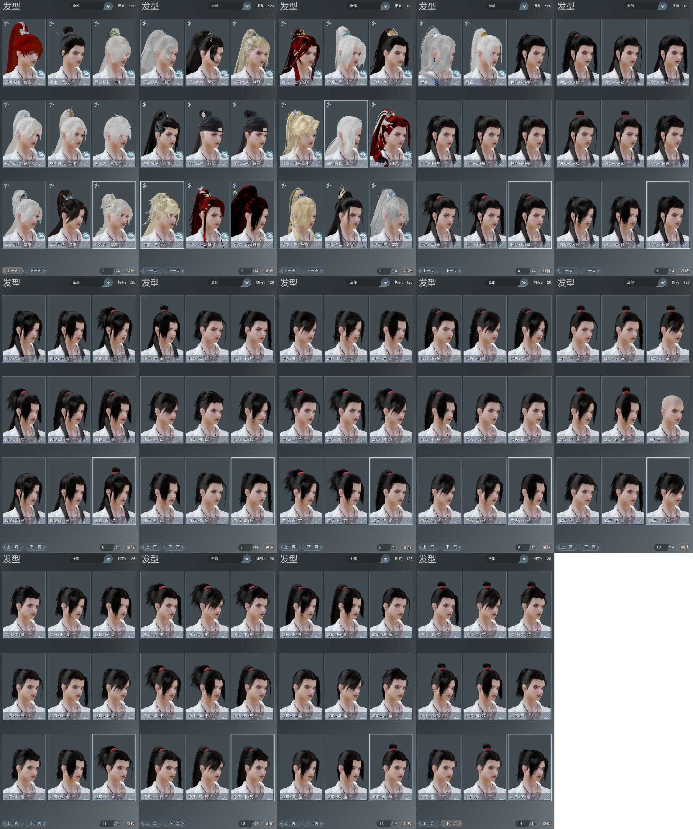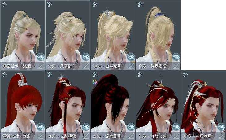 【发型】金发4个[资历金, 国金, 凤金, 绿游园金发], 红发5个[八红, 九红, 十一红, 小资历红, 雪漠飞绫红发], 黑发8个, 白发13个, 盒子发型[二代七夕白, 雪月白发, 唐风韶颜黑发, 绿游园黑发, 小金龙黑发, 唐风韶颜白发, 小金龙白发, 黑上火白发], 总页数14