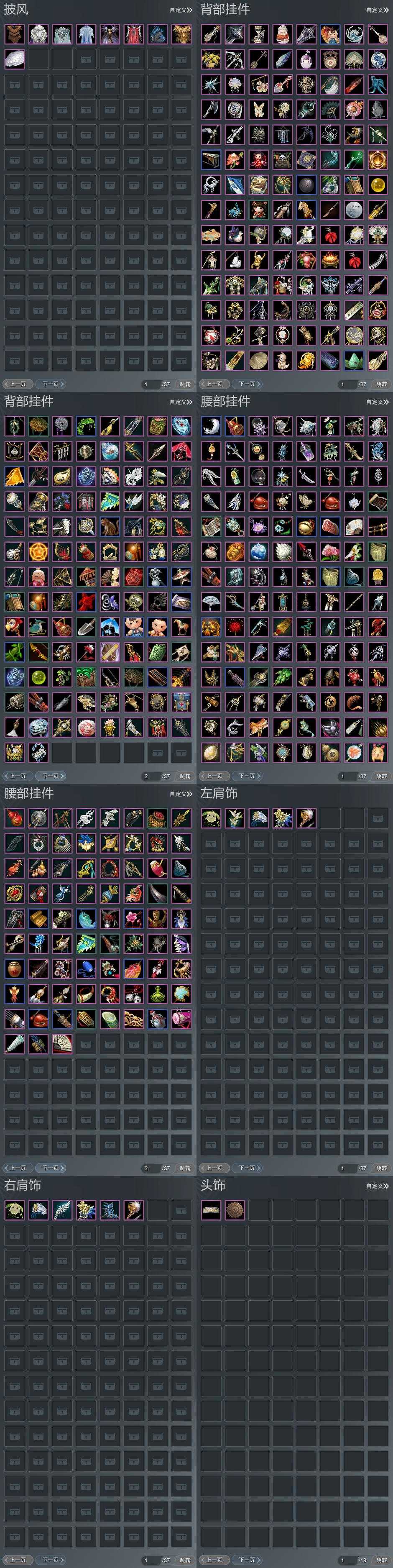 【披风】9个,[雪啸刚风, 7W资历披风, 刀宗预热披风, 一代浩气, 情R枕, 空山闲雪, 云麒赫奕]