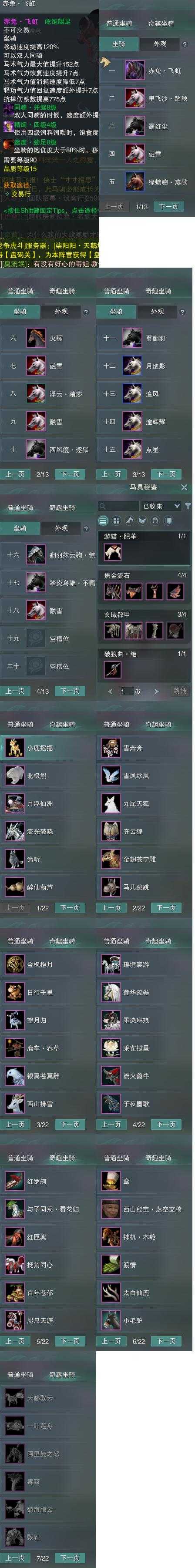 【坐骑】18个[踏炎不羁, 西风瘦逐狱, 翻羽抹云驹惊华, 里飞沙踏秋, 劲足赤兔飞虹, 霸红尘]