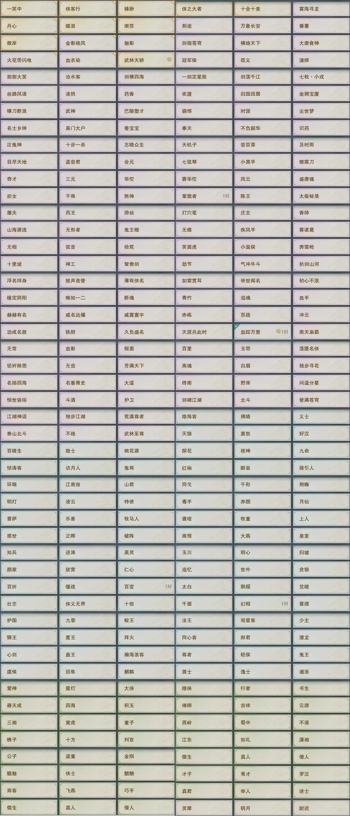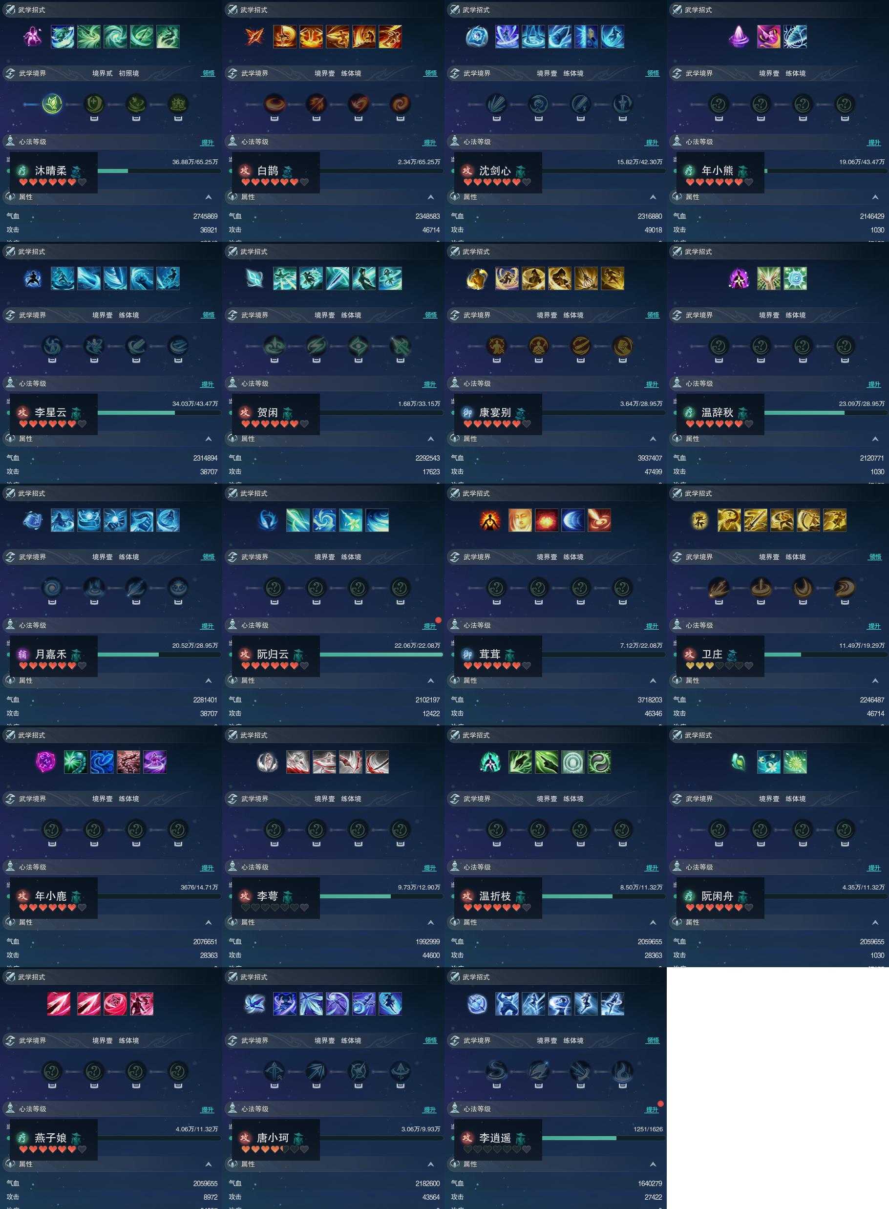 【同伴】沐晴柔81级境界贰,白鹊慈81级境界壹,沈剑心79级境界壹,年小熊78级境界壹,李星云78级境界壹,贺闲志76级境界壹,康宴别75级境界壹,温辞秋75级境界壹,月嘉禾75级境界壹,阮归云73级境界壹,茸茸志73级境界壹,卫庄意72级境界壹,年小鹿70级境界壹,李萼志69级境界壹,温折枝68级境界壹,阮闲舟68级境界壹,燕子娘68级境界壹,唐小珂67级境界壹,李逍遥15级境界壹